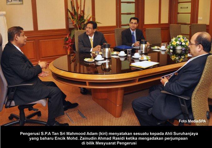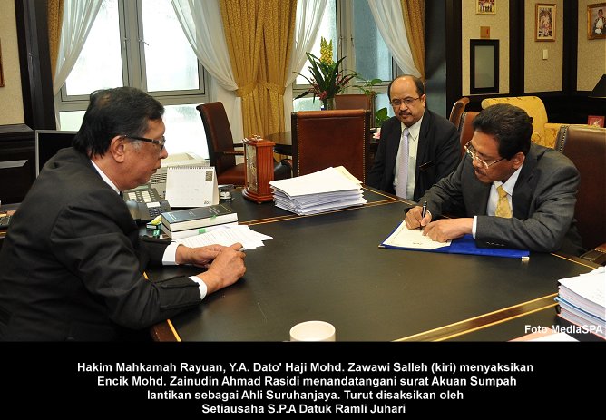 SPA 21 Mei ----- Suruhanjaya Perkhidmatan Awam Malaysia (S.P.A) telah menerima seorang Ahli Suruhanjaya yang baharu iaitu Encik Mohd. Zainudin Ahmad Rasidi. Upacara mengangkat sumpah telah dilakukan dihadapan Hakim Mahkamah Rayuan, Y.A. Dato' Haji Mohd. Zawawi Salleh di Istana Kehakiman, Putrajaya dengan diiringi Setiausaha S.P.A. YBhg. Datuk Ramli Juhari. Selepas upacara mengangkat sumpah beliau telah mengadakan perjumpaan bersama Pengerusi S.P.A, YBhg. Tan Sri Mahmood Adam dan menandatangani surat penerimaan jawatan secara rasmi. ------ MediaSPA