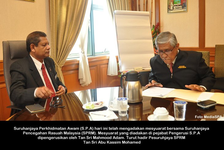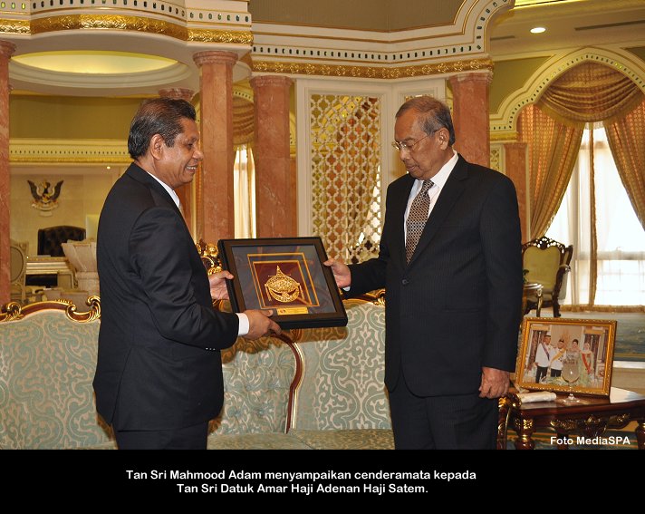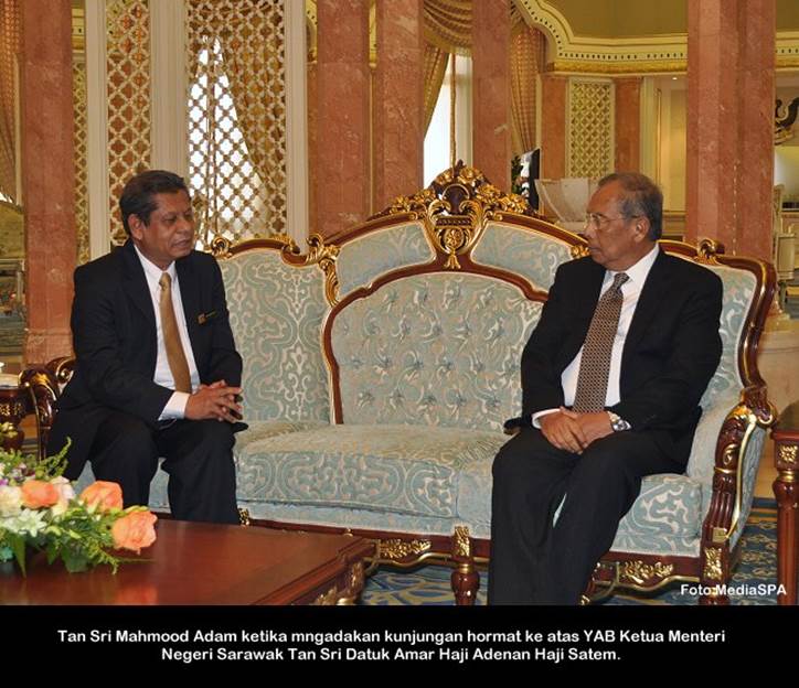KUCHING, 25 JUN------ Pengerusi S.P.A Tan Sri Mahmood Adam petang tadi telah mengadakan kunjungan hormat ke atas Ketua Menteri Negeri Sarawak, YAB Tan Sri Datuk Amar Haji Adenan Haji Satem. Turut hadir Timbalan Pengerusi Dato’ R. Segarajah, Ahli Suruhanjaya Tuan Haji Onn Haji Abdullah, Setiausaha S.P.A Datuk Ramli Juhari, Pegawai Tugas-Tugas Khas Tuan Hali Abdullah Jamil dan Setiausaha Urus Setia S.P.A Cawangan Sarawak Abdul Halim Abang Naili. Kunjungan selama 35 minit itu telah diadakan di Pejabat Ketua Menteri, di bangunan Dewan Undangan Negeri Sarawak. ------MediaSPA
