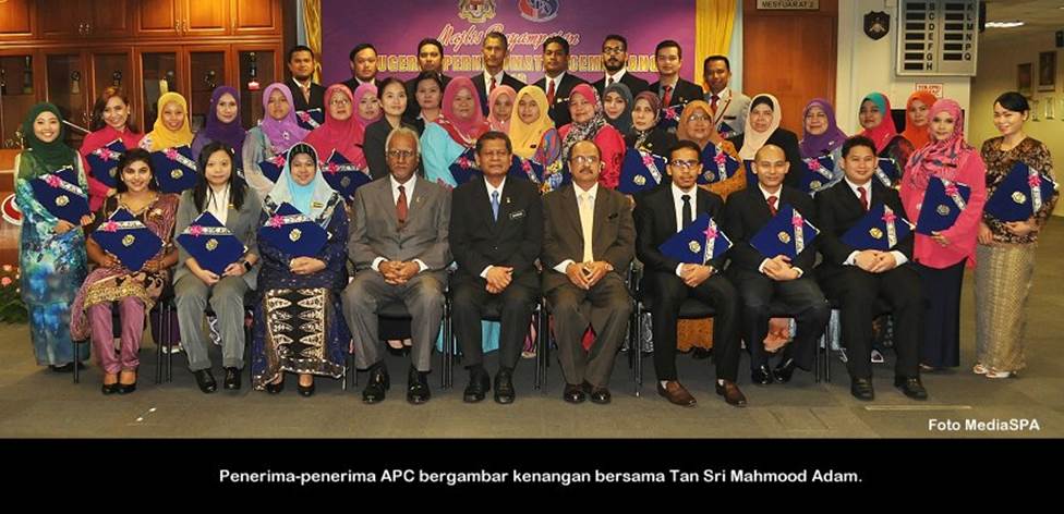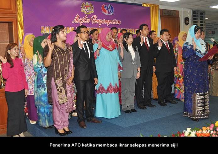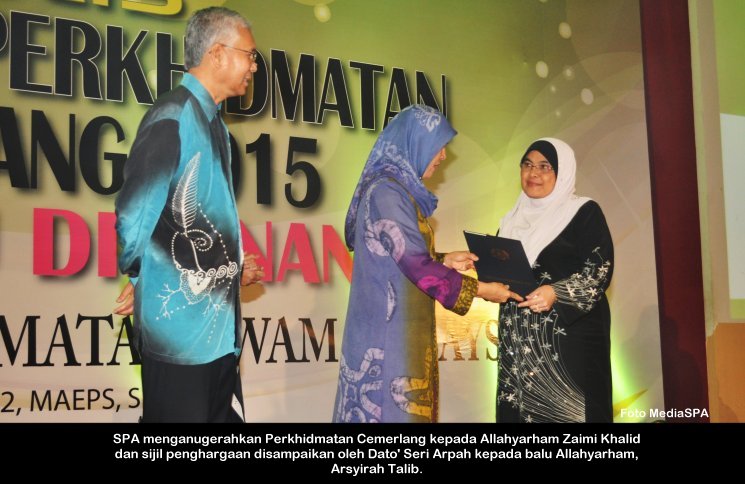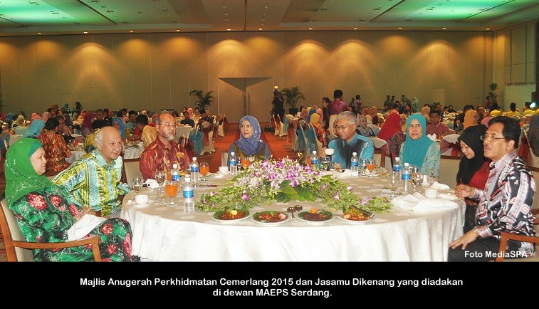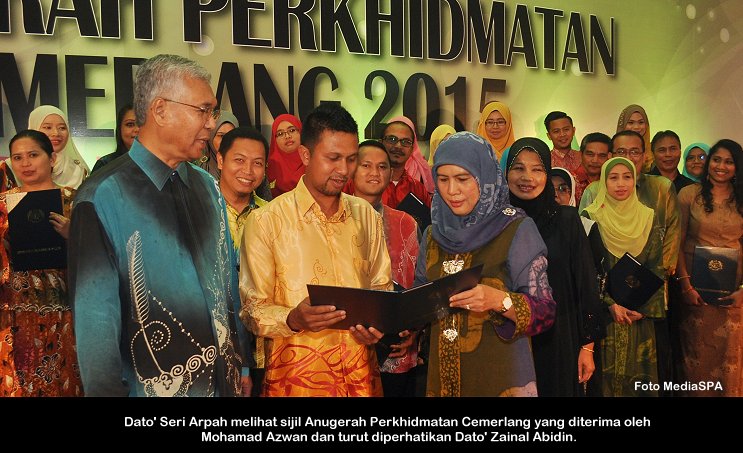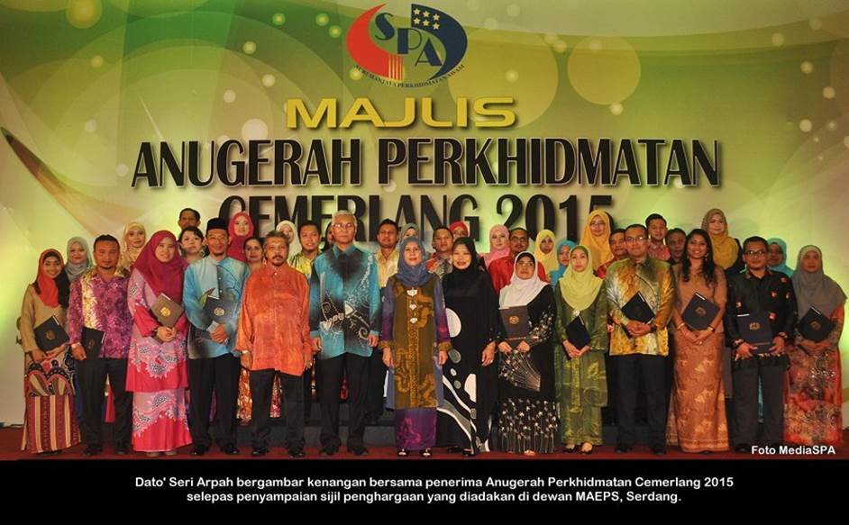 SERDANG 11 Mac ----- Suruhanjaya Perkhidmatan Awam Malaysia (S.P.A) telah mengadakan Majlis Anugerah Perkhidmatan Cemerlang (APC) 2015 yang diadakan di Dewan MAEPS, Serdang Jumaat lepas. Seramai 37 penerima APC telah menerima sijil penghargaan yang disampaikan oleh Pengerusi S.P.A, Dato’ Seri Arpah Abdul Razak. S.P.A juga telah mengadakan majlis jasamu dikenang sempena tamat perkhidmatan Ahli-Ahli Suruhanjaya iaitu Dato’ Mohd Zain Mohd Dom, Tuan Haji Sumali Amat dan Dato’ Mhd Najri Abd Hamid. ----- MediaSPA