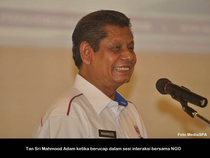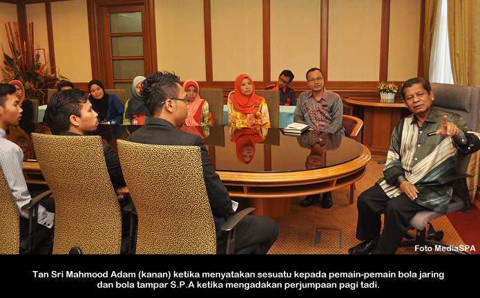 KUCHING, 26 JUN------ Tan Sri Mahmood Adam hari ini berkata, mana-mana kumpulan dari kalangan warga S.P.A yang ingin bermain dalam aktiviti sukan agar menubuhkan kelab yang berdaftar. Beliau berkata demikian semasa mengadakan perjumpaan dengan pemain-pemain bola tampar dan bola jaring yang bermain mewakili S.P.A. diperingkat JPM dan MAKSWIP. Katanya lagi penubuhan kelab sukan yang berdaftar adalah penting, kerana ia mengikut peraturan dan boleh mengelakkan dari sebarang kejadian yang tidak diingini berlaku. Katanya lagi, kakitangan awam tidak dihalang untuk aktif dalam sebarang sukan kerana ia boleh menjadikan individu lebih sihat disamping menjalankan tugas-tugas hakiki. ------MediaSPA