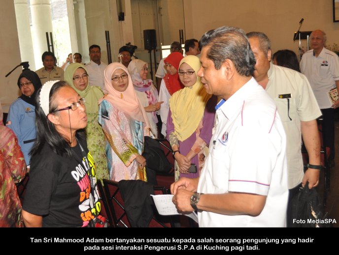 KUCHING, 25 JUN------ Pengerusi S.P.A Tan Sri Mahmood Adam hari ini mengadakan sesi interaksi dengan ketua-ketua Jabatan Persekutuan, Badan-Badan Berkanun Persatuan-Persatuan Dan Badan-badan Bukan Kerajaan. Sesi interaksi yang diadakan di Sarawak Tuorism Compleks, dihadiri Timbalan Pengerusi Dato’ R. Segarajah, Ahli-Ahli Suruhanjaya dan pegawai-pegawai kanan. S.P.A. turut juga mengadakan karnival Kerjaya. ------MediaSPA