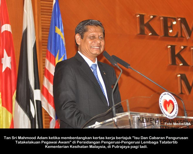 PUTRAJAYA, 27 Mei------ Pengerusi S.P.A Tan Sri Mahmood Adam pagi tadi hadir di majis Persidangan Pengerusi-Pengerusi Lembaga Tatatertib, Kementerian Kesihatan Malaysia di Putrajaya. Majlis yang dirasmikan oleh Ketua Setiausaha Kementerian Kesihatan Malaysia, Datuk Farida Mohd Ali, turut dihadiri Setiausaha S.P.A, Puan Lim Mooi Eia. Persidangan sehari Kementerian itu telah dihadiri seramai 350 peserta dan Tan Sri Mahmood Adam membentangkan kertas kerja bertajuk “isu dan cabaran pengurusan tatakelakuan pegawai awam”. ------MediaSPA