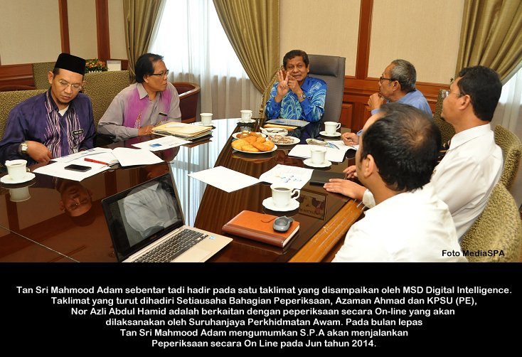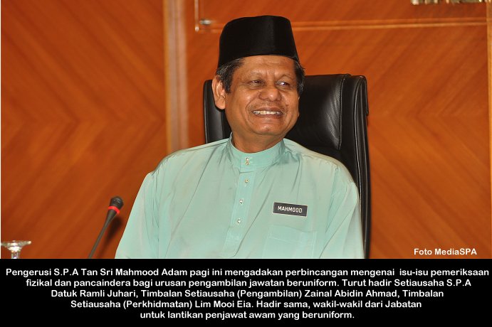 S.P.A, 11 Januari ------ Suruhanjaya Perkhidmatan Awam Malaysia (S.P.A) hari ini telah mengadakan Majlis Anugerah Perkhidmatan Cemerlang (APC) 2012. Penyampaian sijil dan hadiah insentif berupa wang tunai telah disempurnakan oleh Pengerusi S.P.A, YBhg. Tan Sri Mahmood Adam. Turut hadir Setiausaha SPA, YBhg Datuk Ramli Juhari, Timbalan Setiausaha Perkhidmatan, Puan Lim Mooi Eia, Timbalan Setiausaha Pengambilan Encik Zainal Abidin Ahmad, Pegawai-pegawai kanan dan warga SPA. Seramai 34 orang calon penerima APC pada tahun 2012 yang diadakan di Dewan Temu Duga Putrajaya. Dalam ucapan yang disampaikan oleh YBhg. Tan Sri Mahmood, beliau mengucapkan tahniah kepada penerima-penerima APC dan berharap mereka sama-sama dapat menjayakan transformasi yang dilaksanakan oleh S.P.A dari semasa ke semasa. ------ MediaSPA