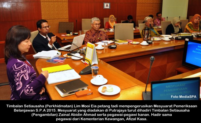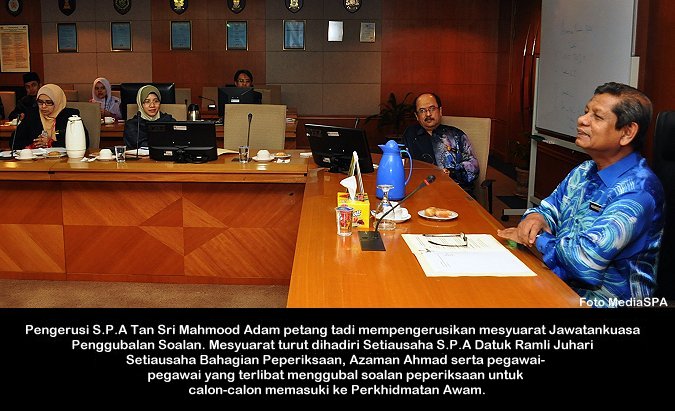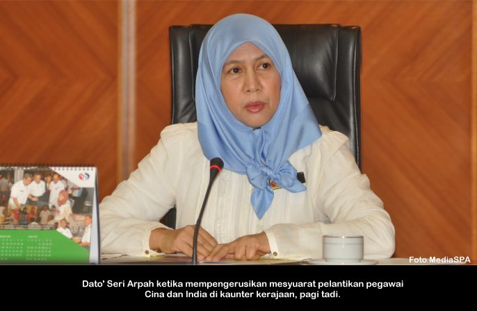PUTRAJAYA, 25 Ogos------ Pengerusi S.P.A, Dato’ Seri Arpah Abdul Razak hari ini mempengerusikan mesyuarat bagi membincangkan arahan pelantikan pegawai Cina dan India di kaunter agensi-agensi kerajaan. Mesyuarat yang diadakan di Putrajaya turut di hadiri Setiausaha Puan Lim Mooi Eia dan wakil pegawai daripada agensi yang terlibat. ------MediaSPA
