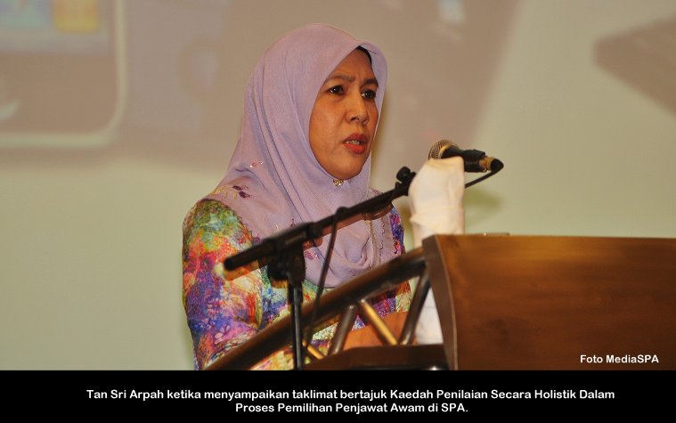 PUTRAJAYA, 4 Oktober------ Pengerusi SPA, YBhg. Tan Sri Arpah Abdul Razak hari ini telah menyampaikan taklimat bertajuk Kaedah Penilaian Secara Holistik Dalam Proses Pemilihan Penjawat Awam di SPA. Taklimat yang diadakan di Dewan Sri Siantan, Perbadanan Putrajaya itu bersempena dengan Persidangan Psikologi 2016 anjuran Jabatan Perkhidmatan Awam (JPA). Persidangan selama (tiga) 3 hari itu dihadiri seramai 700 orang peserta terdiri daripada pegawai-pegawai psikologi Kementerian dan Jabatan serta Rakan Pembimbing Perkhidmatan Awam (AKRAB). ------ MediaSPA