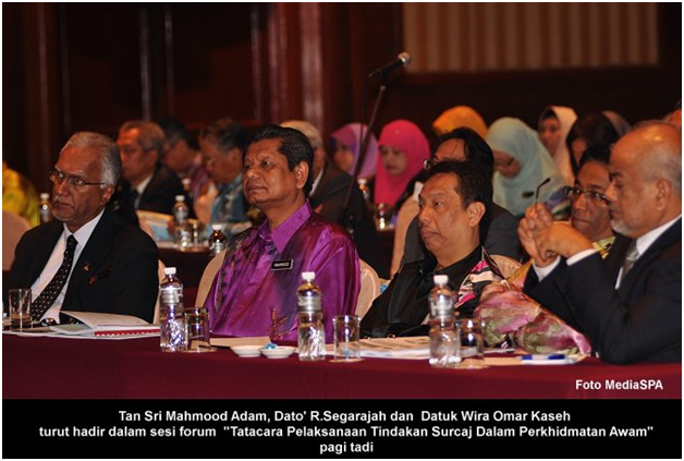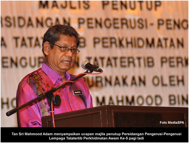 MELAKA, 17 Januari ------ Pengerusi Suruhanjaya Perkhidmatan Awam (S.P.A), YBhg. Tan Sri Mahmood Adam hari ini telah menyempurnakan Majlis Penutupan Persidangan Pengerusi-Pengerusi Lembaga Tatatertib Perkhidmatan Awam Ke-5. Hadir sama, Timbalan Pengerusi S.P.A, YBhg. Dato' R.Segarajah, Ahli-Ahli Suruhanjaya, Timbalan Ketua Pengarah Perkhidmatan Awam (Operasi), YBhg. Dato' Dr. Ismail Bin Alias dan Setiausaha S.P.A, YBhg. Datuk Ramli Juhari. Terdahulu dari itu satu Forum bertajuk "Tatacara Pelaksanaan Tindakan Surcaj Dalam Perkhidmatan Awam" telah dibentangkan oleh tiga orang panel iaitu YBhg. Dato' S. Kumaran, Setiausaha Bahagian Kewangan Strategik Kementerian Kewangan, YBhg. Tan Sri Dato' Setia Ambrin Buang, Ketua Audit Negara dan YBhg. Prof. Emeritus Datuk Dr. Shad Saleem Faruki Penasihat Undang-Undang Universiti Teknologi Mara. Sementara itu, YBhg. Dato' Dr. Madinah Mohamad, Ketua Setiausaha Kementerian Sains, Teknologi dan Inovasi menjadi Moderator forum tersebut. Dalam Majlis Penutupan Persidangan ini juga, YBhg. Tan Sri Mahmood Adam telah menyampaikan Sijil Pentauliahan kepada 13 Pegawai Pemudah Cara Pengurusan Tatatertib Perkhidmatan Awam. Persidangan selama dua hari ini, telah dirasmikan oleh Ketua Menteri Melaka, YAB Datuk Seri Haji Mohd Ali Mohd Rustam semalam. ------ MediaSPA