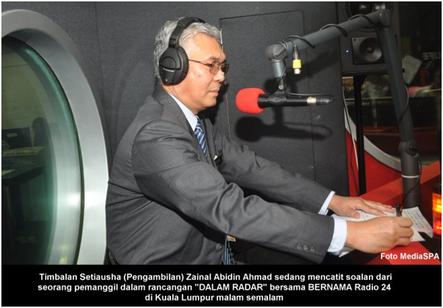 KUALA LUMPUR, 19 Januari ------ PTimbalan Setiausaha (Pengambilan), Encik Zainal Abidin Ahmad malam tadi telah bersiaran secara langsung di Stesan Bernama Radio 24, di Wisma Bernama, Kuala Lumpur. Rancangan yang bernama "DALAM RADAR" telah ke udara dari jam 7 malam hingga 8 malam bersama peneraju Wan Syahrina dan Ikmal Hafis. Antara topik yang dibincangkan adalah mengenai kriteria yang perlu ada pada penjawat awam dan layanan penjawat awam kepada orang ramai/pelanggan terutama di kaunter barisan hadapan. Rancangan ini juga dibuka kepada orang ramai untuk panggilan telefon secara langsung. ------ MediaSPA