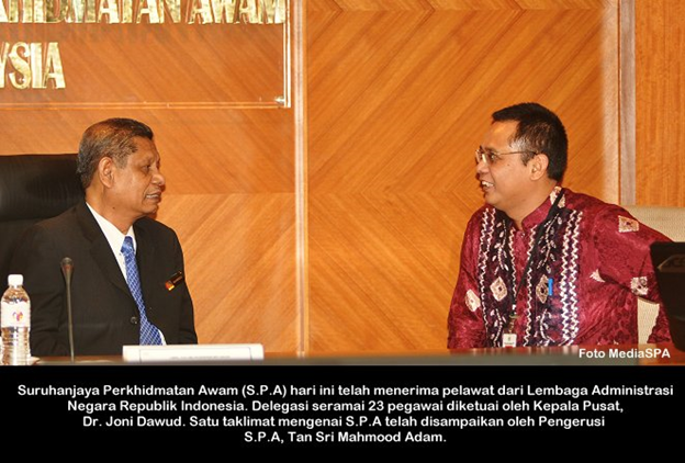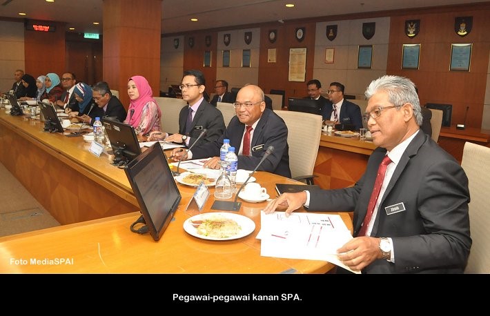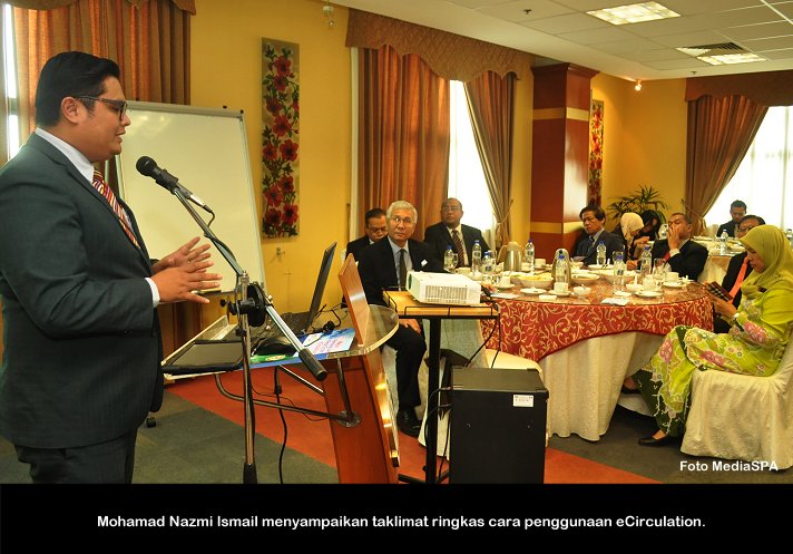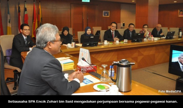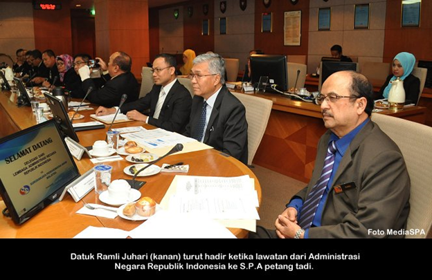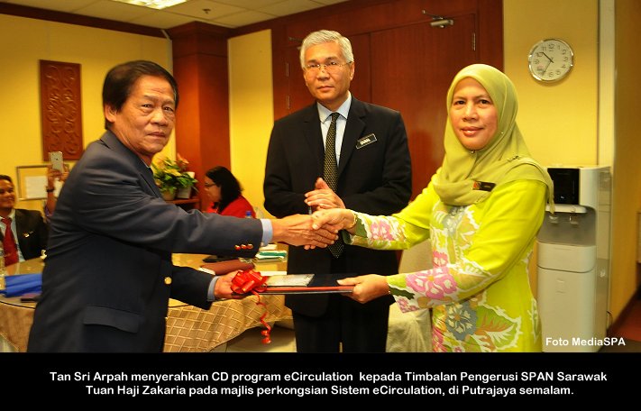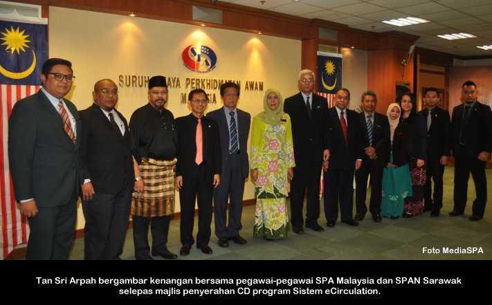 PUTRAJAYA, 14 Oktober ------ Pengerusi SPA, YBhg. Tan Sri Arpah Abdul Razak hari ini hadir ke Majlis Perkongsian Pintar Sistem eCirculation antara Suruhanjaya Perkhidmatan Awam Malaysia dengan Suruhanjaya Perkhidmatan Awam Negeri Sarawak. eCirculation adalah merupakan satu sistem yang telah dibangunkan sendiri oleh SPA bagi mempermudahkan urusan kelulusan kertas pertimbangan Suruhanjaya di mana dengan menggunakan sistem ini kertas-kertas yang memerlukan kelulusan segera dapat dibentangkan dan diedarkan secara dalam talian tanpa perlu menunggu mesyuarat Suruhanjaya yang seterusnya. Hadir sama Timbalan Pengerusi SPAN Sarawak, Tuan Haji Zakaria P. Nyumay dan Setiausaha SPA Malaysia, YBhg. Dato’ Zainal Abidin Ahmad. ------ MediaSPA