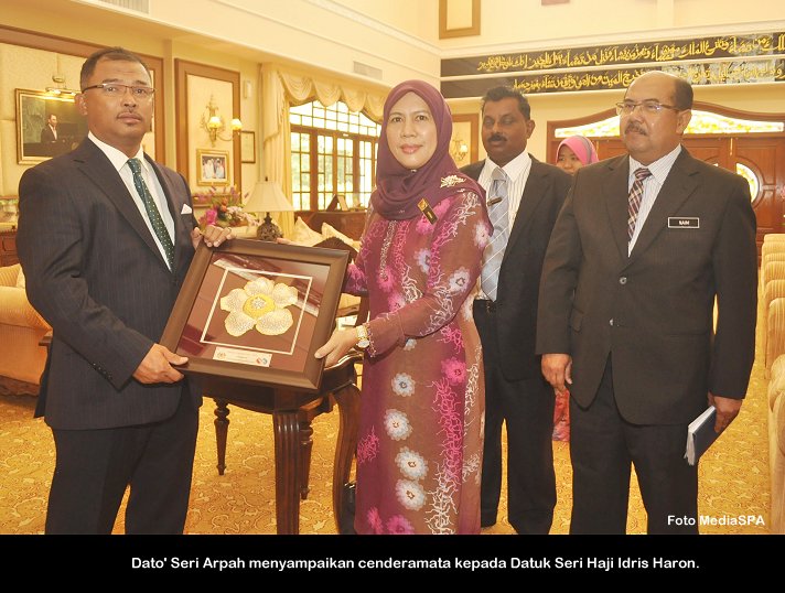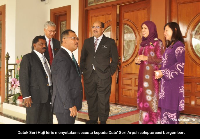 MELAKA, 1 Sept ------ Pengerusi S.P.A Dato’ Seri Arpah Abdul Razak hari ini telah membuat kunjungan hormat ke atas Ketua Menteri Melaka, YAB Datuk Seri Haji Idris Haron di Ayer Keroh, Melaka pagi tadi. Pengerusi S.P.A itu turut diiringi Setiausaha Puan Lim Mooi Eia dan Timbalan Setiausaha (Pengambilan) Dato’ Zainal Abidin Ahmad. Hadir sama Setiausaha Kerajaan Negeri Melaka, Datuk Wira Haji Naim Abu Bakar. Kunjungan selama 45 minit itu diadakan di kediaman rasmi Ketua Menteri. Seterusnya Dato’ Seri Arpah mengadakan Mesyuarat bersama-sama Exco Hal Ehwal Syarikat, Sumber Manusia dan NGO, YB Datuk M.S Mahadeven serta pegawai-pegawai kanan pejabat Ketua Menteri. ------ MediaSPA