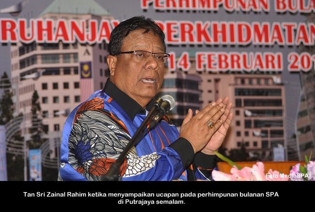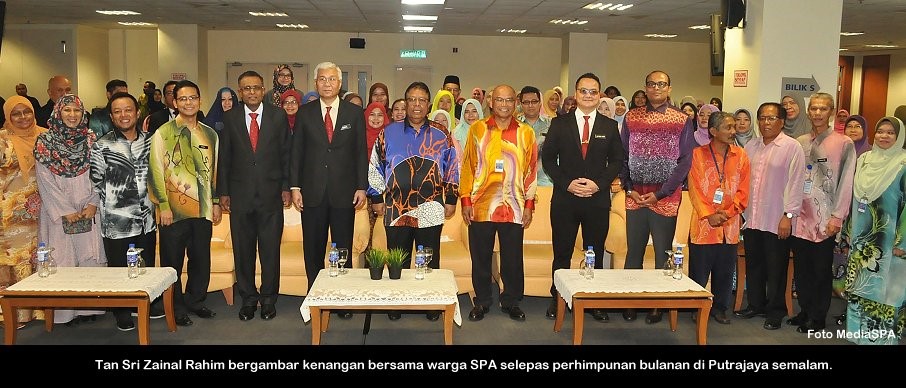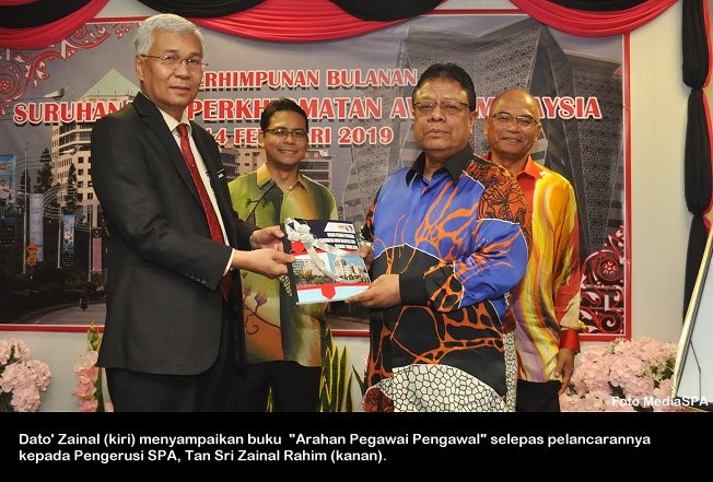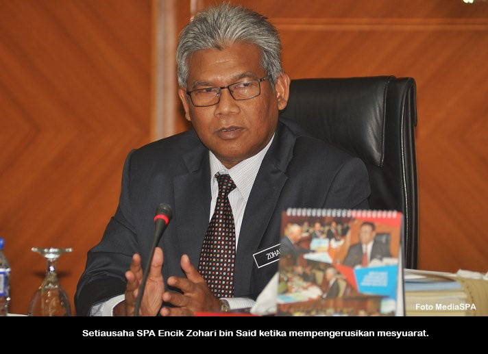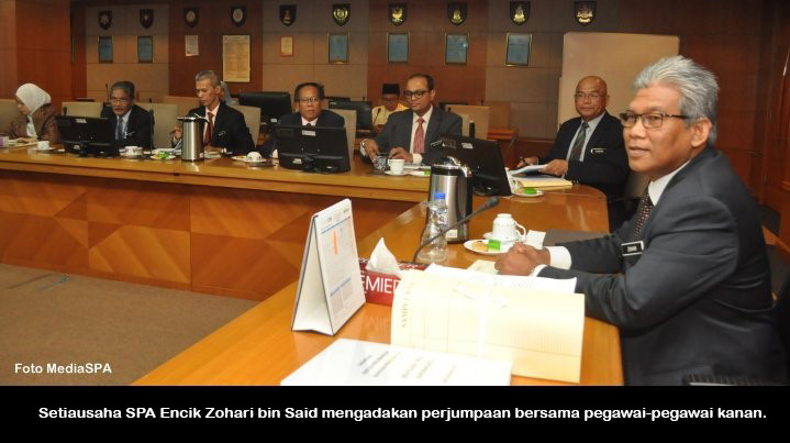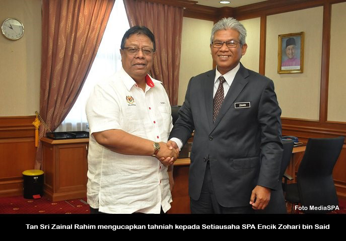 PUTRAJAYA 15 Feb ----- Pengerusi SPA, Tan Sri Zainal Rahim Seman mengucapkan tahniah dan selamat bertugas kepada Encik Zohari Said yang melaporkan diri di Suruhanjaya Perkhidmatan Awam sebagai Setiausaha SPA yang baharu menggantikan Dato’ Zainal Abidin Ahmad yang bersara wajib mulai hari ini. Setelah mengadakan perbincangan bersama Tan Sri Zainal selama 50 minit, beliau mengadakan perjumpaan dengan pegawai-pegawai kanan dan mempengerusikan mesyuarat di bilik mesyuarat Suruhanjaya di aras 10 ----- MediaSPA