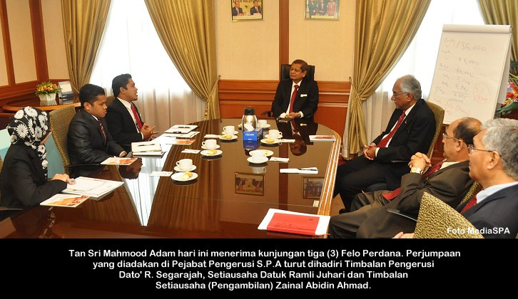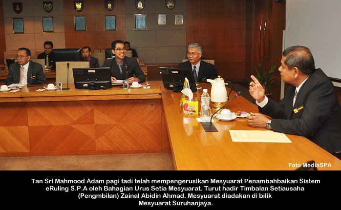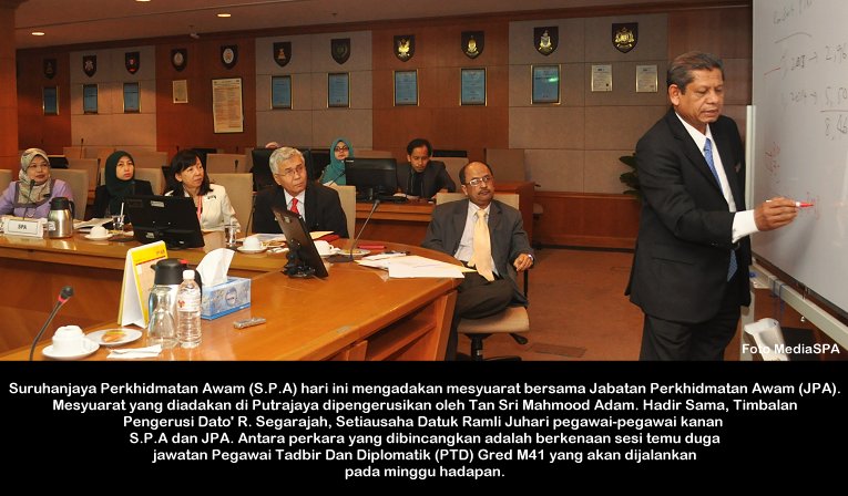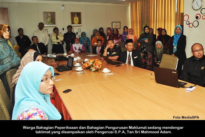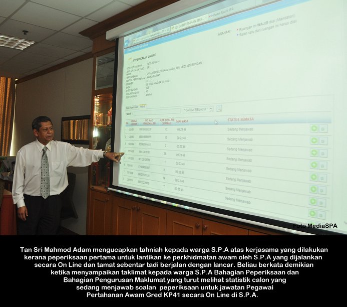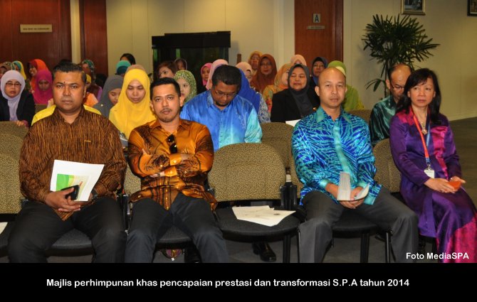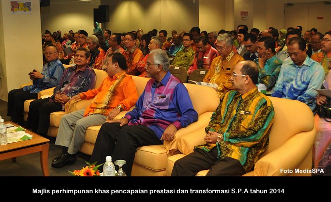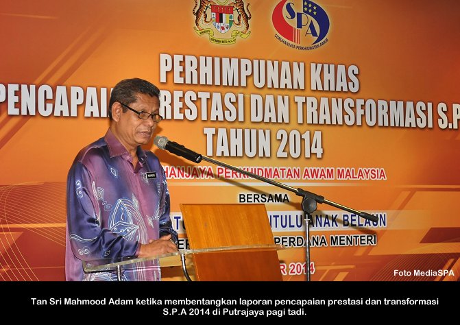 PUTRAJAYA 4 Dis  ------ Pengerusi S.P.A, Tan Sri Mahmood Adam berkata, seramai 7.7 juta pelanggan telah mendapat manfaat hasil dari transformasi yang dilaksanakan oleh S.P.A pada tahun ini sehingga November 2014. Belau berkata demikian ketika membentangkan laporan “Report Kad” S.P.A kepada YB. Menteri di majlis Perhimpunan Khas Pencapaian Prestasi Dan Transformasi S.P.A Tahun 2014 di Putrajaya pagi tadi. Hadir, Menteri di Jabatan Perdana Menteri, YB Datuk Joseph Entulu anak Belaun, Pengerusi S.P.P Datuk Dr.Halil Dolhan, Timbalan Pengerusi S.P.A Dato’ R. Segarajah, Pengerusi-Pengerusi S.P.A Negeri, Ahli-Ahli Suruhanjaya serta wakil-wakil Jabatan serta NGO. Dimajlis yang sama juga upacara menandatangani surat perjanjian pelaksanaan peperiksaan secara dalam talian antara S.P.A dengan JARING Communications dan Novatis Recourses Sdn.Bhd serta penyampaian sijil penghargaan kepada semua pihak yang terlibat atas sumbangan dalam menjayakan produk 1 Malaysia Transformasi S.P.A pada tahun 2014.  ------  MediaSPA