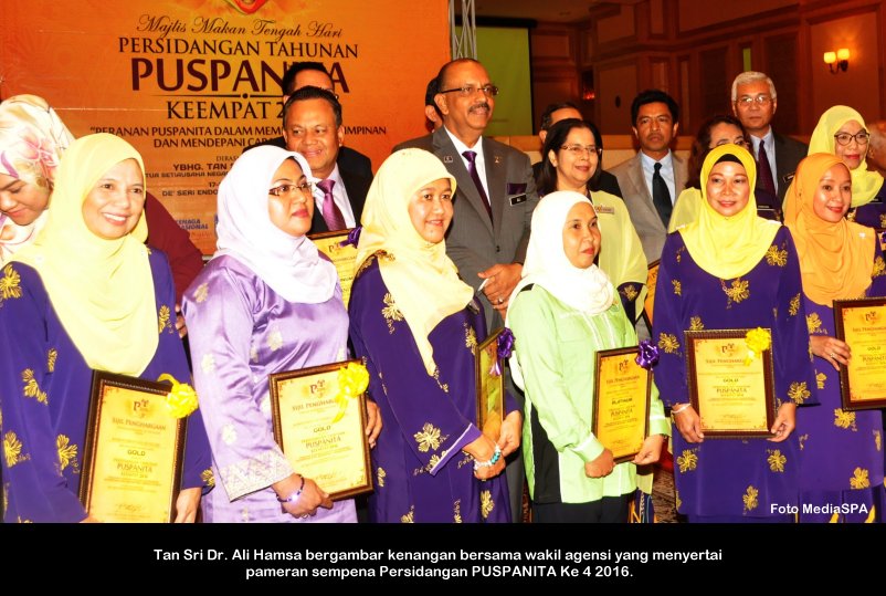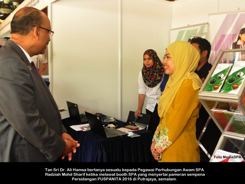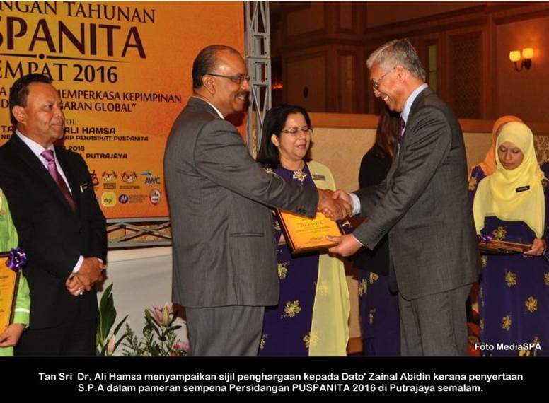 PUTRAJAYA, 17 November ------ Ketua Setiausaha Negara, YBhg. Tan Sri Dr. Ali Hamsa telah merasmikan Persidangan Tahunan PUSPANITA ke-4 2016 yang diadakan di Dewan Seri Endon, PUSPANITAPURI Putrajaya, semalam. Turut hadir dalam majlis tersebut adalah Setiausaha SPA, YBhg. Dato’ Zainal Abidin Ahmad yang telah menerima Sijil Penghargaan Penyertaan Pameran daripada YBhg. Tan Sri Dr. Ali Hamsa. Persidangan selama dua (2) hari tersebut bertemakan “Peranan PUSPANITA dalam memperkasa kepimpinan dan mendepani cabaran Global”. SPA telah membuka booth pameran kerjaya yang turut disertai oleh pelbagai agensi, kementerian dan jabatan.  ------  MediaSPA