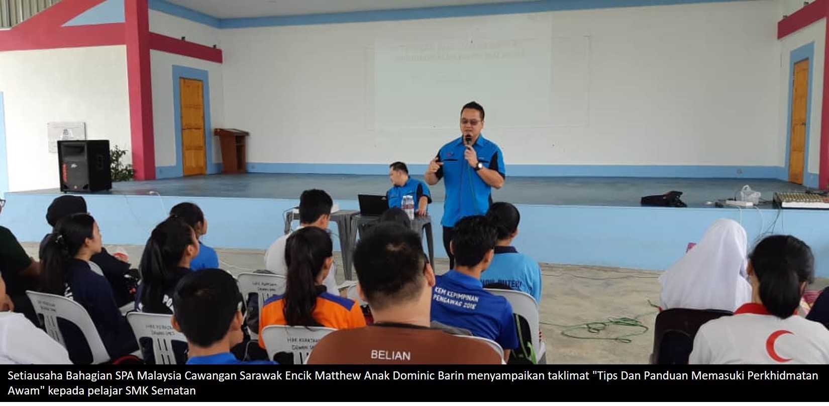 06 Mac 2019(Rabu) ----- Suruhanjaya Perkhidmatan Awam Malaysia Cawangan Sarawak telah mengadakan Program Outreach di Dewan SMK Sematan , Sematan. SMK Sematan terletak lebih kurang 116 KM melalui jalan darat dari pejabat SPA. Pergerakan boleh melalui jalan Matang ke Sempadi dengan menaiki feri Rambungan. Tujuan program ini diadakan adalah untuk memberi maklumat kepada pelajar sekolah berkaitan peluang kerjaya di dalam sektor awam apabila mereka menamatkan persekolahan nanti. Taklimat "Tips dan Panduan Memasuki Perkhidmatan Awam Malaysia" telah disampaikan oleh Setiausaha Bahagian iaitu Encik Matthew Anak Dominic Barin, turut terlibat dalam program kali ini adalah Encik Siw Woo Kiiong(PSU PG) dan Puan Amelna Anuar(PSU KT). Selain itu SPA Malaysia Cawangan Sarawak juga membuka booth pameran bagi memudahkan pelajar mendapatkan maklumat berkaitan perkhidmatan yang disediakan oleh SPA. Seramai 168 pelajar yang terlibat dalam program kali ini.