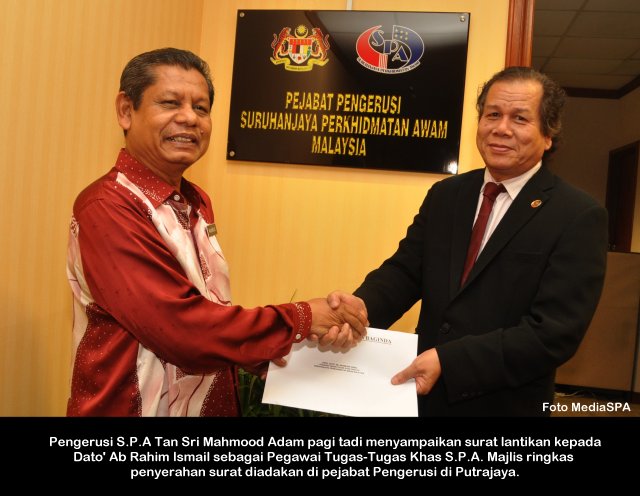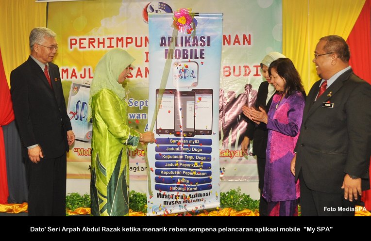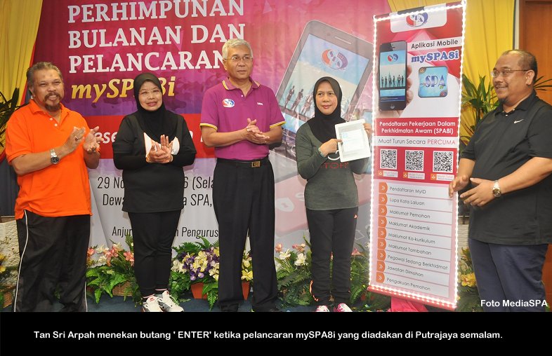 PUTRAJAYA, 29 November ------ Suruhanjaya Perkhidmatan Awam Malaysia (SPA) telah melancarkan aplikasi mudah alih iaitu mySPA8i sebagai alternatif kepada Sistem SPA8i versi web. Majlis pelancaran telah disempurnakan oleh Pengerusi SPA, YBhg. Tan Sri Arpah Abdul Razak. Turut hadir Setiausaha SPA, YBhg. Dato’ Zainal Abidin Ahmad, Timbalan Setiausaha (Perkhidmatan), Puan Salmah Idris dan Timbalan Setiausaha (Pengambilan), Tuan Haji Abdullah Tahir. Aplikasi mudah alih mySPA8i ini boleh dimuat turun dan digunakan bagi peranti yang beroperasikan Android, iOS dan Windows. Aplikasi mudah alih yang telah dibangunkan dengan kerjasama MAMPU ini terdapat beberapa modul antaranya seperti Pendaftaran MyID, Lupa Kata Laluan, Maklumat Pemohon, Maklumat Akademik, Maklumat Kokurikulum, Maklumat Tambahan, Pegawai Sedang Berkhidmat, Jawatan Dimohon dan Pengakuan Pemohon. ------  MediaSPA