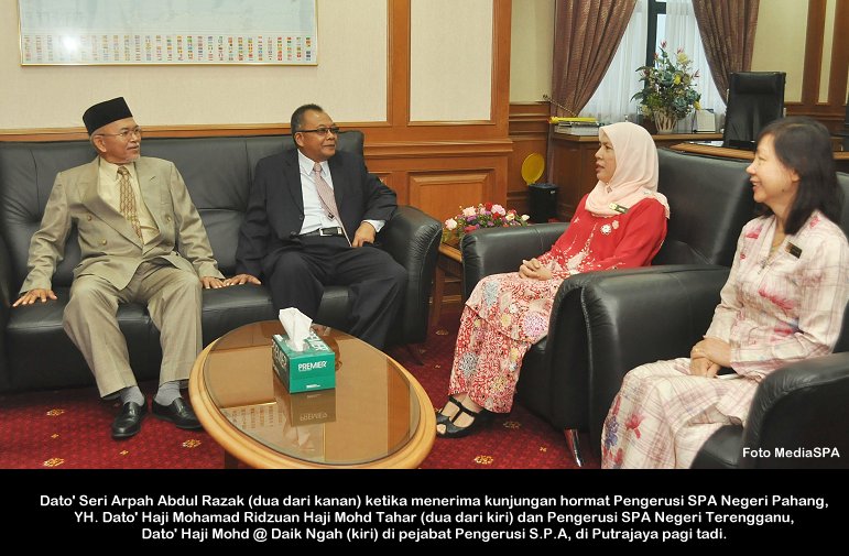 PUTRAJAYA, 17 Sept ------ Pengerusi S.P.A, Dato’ Seri Arpah Abdul Razak hari ini menerima kunjungan hormat Pengerusi SPA Negeri Pahang, YH. Dato’ Haji Mohamad Ridzwan Haji Mohd Tahar dan Pengerusi SPA Negeri Terengganu, Dato’ Haji Mohd @ Daik Ngah. Delegasi Pengerusi SPA Negeri-negeri bersama-sama Ahli-Ahli Suruhanjaya itu turut diberi taklimat oleh Setiausaha S.P.A Malaysia Puan Lim Mooi Eia. Terdahulu ketibaan YH. Dato’ Haji Mohamad Ridzwan dan Dato’ Haji Mohd @ Daik disambut oleh Dato’ Seri Arpah di pejabatnya di Putrajaya.  ------  MediaSPA