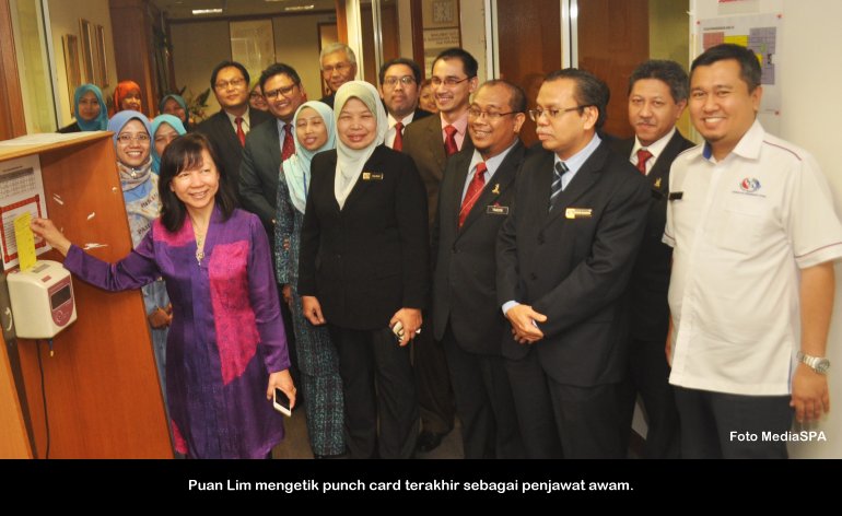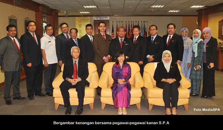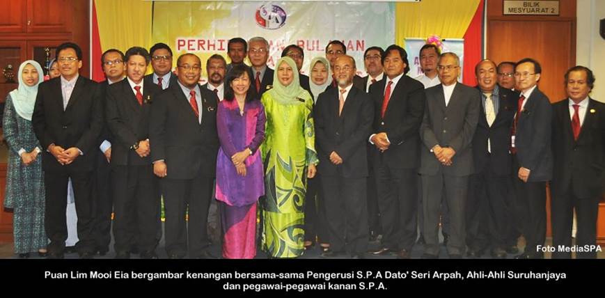 PUTRAJAYA, 22 Sept  ------ “Terima kasih semua warga S.P.A” itulah kata-kata akhir Puan Lim Mooi Eia sebagai Setiausaha S.P.A yang bersara wajib sebagai penjawat awam pada hari ini. Beliau berkata demikian dalam ucapan balas dihadapan warga S.P.A pada perhimpunan bulanan di Putrajaya petang semalam. Turut hadir Pengerusi S.P.A Dato’ Seri Arpah Abdul Razak, Ahli-Ahli Suruhanjaya serta warga S.P.A. Terdahulu dalam ucapan aluan, Dato’ Seri Arpah Abdul Razak yang mewakili kerajaan mengucapkan terima kasih atas sumbangan Puan Lim Mooi Eia yang turut membawa pelbagai kejayaan melalui Transformasi S.P.A antaranya pelaksanaan peperiksaan on line. Di majlis itu juga Pengerusi S.P.A turut melancarkan aplikasi mobile yang dipanggil myS.P.A yang bertujuan untuk mendapatkan maklumat lebih pantas terutama pelanggan S.P.A, antaranya keputusan temu duga dan sebagainya.  ------  MediaSPA