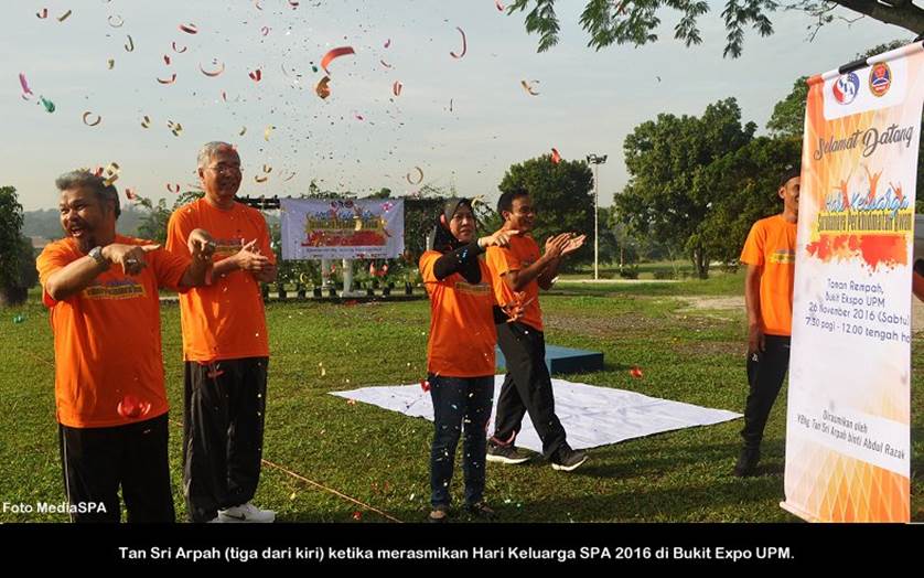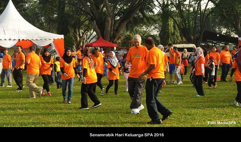 PUTRAJAYA, 28 November ------ Persatuan Anggota-Anggota Suruhanjaya Perkhidmatan Awam (PASPA) telah menganjurkan Hari Keluarga SPA 2016 yang diadakan di Taman Rempah Bukit Expo, UPM Serdang Sabtu lepas. Majlis perasmian telah disempurnakan oleh Pengerusi SPA, YBhg. Tan Sri Arpah Abdul Razak. Hari Keluarga yang bermula pada jam 8 pagi itu turut dihadiri Setiausaha SPA, YBhg. Dato’ Zainal Abidin Ahmad, Ahli-Ahli Suruhanjaya serta warga SPA. Acara dimulakan dengan senamrobik diikuti sukaneka yang disertai oleh Ahli-Ahli Suruhanjaya, warga SPA serta ahli keluarga. ------  MediaSPA