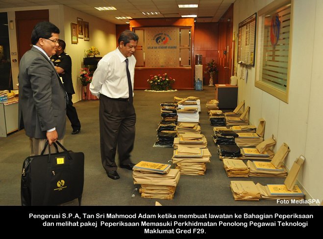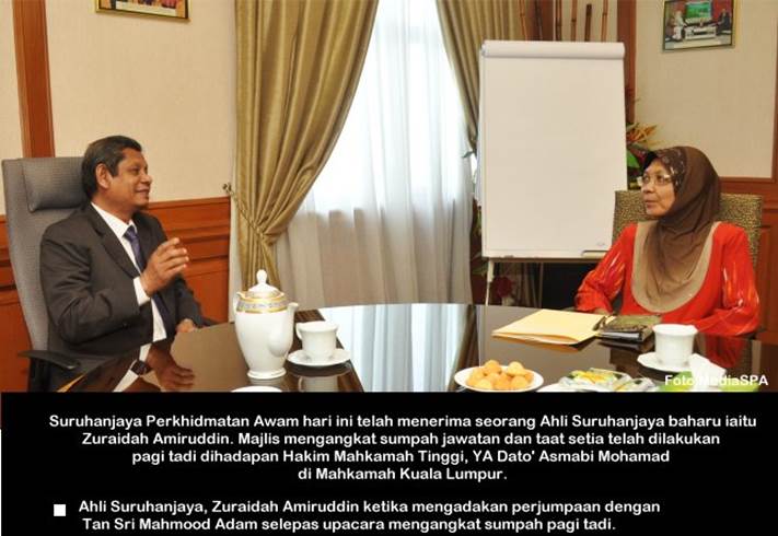 PUTRAJAYA, 30 November------ Suruhanjaya Perkhidmatan Awam Malaysia (SPA) telah menerima enam (6) orang Ahli Suruhanjaya yang baharu semalam. Ahli-Ahli Suruhanjaya tersebut adalah YBhg. Dato’ Sri Zoal Azha Yusof (Timbalan Pengerusi), YBhg. Datuk Yeow Chin Kiong (Ahli), YBhg. Datuk Md Yahaya Masimin (Ahli), YBhg. Dato’ Abdul Ghafar Musa (Ahli), YBhg. Dato’ Haji Nasir Mat. Dam (Ahli) dan YBhg. Datuk Dr. Narimah Yahaya (Ahli). Majlis Angkat Sumpah telah dijalankan semalam dihadapan Hakim Mahkamah Persekutuan, YA Tan Sri Azahar Mohamed di Istana Kehakiman dan turut disaksikan oleh Setiausaha SPA , YBhg. Datuk Zainal Abidin Ahmad. ------ MediaSPA