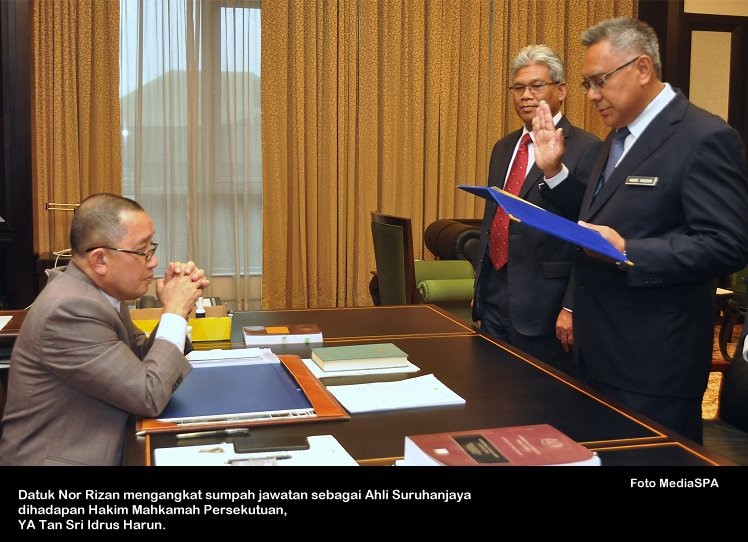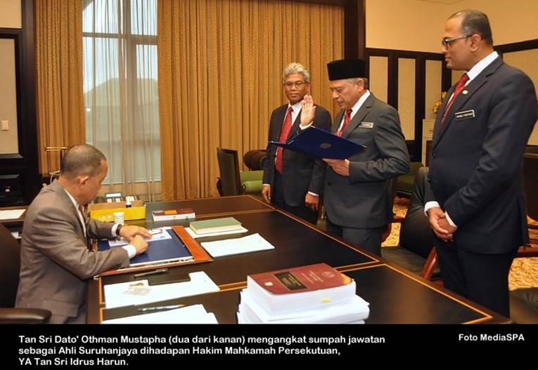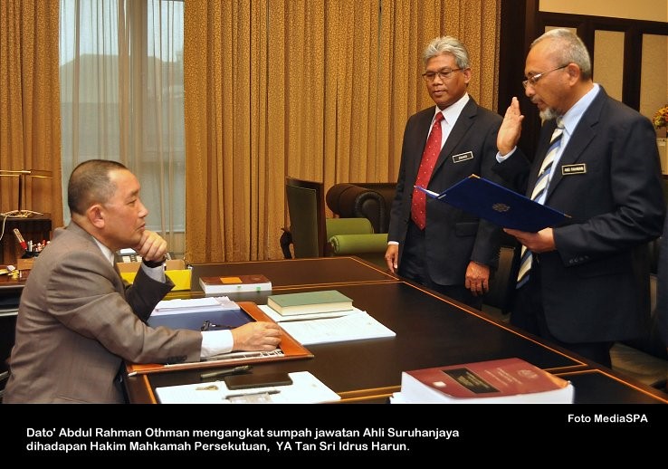 PUTRAJAYA, 1 April ------ Suruhanjaya Perkhidmatan Awam Malaysia (SPA) telah menerima empat (4) orang Ahli Suruhanjaya yang baharu semalam. Ahli-Ahli Suruhanjaya tersebut adalah YBhg. Tan Sri Dato’ Othman Mustapha, YBhg. Datuk Nor Rizan Mohd Thani, YBhg. Dato’ Abdul Rahman Othman dan YBhg. Datu Hajah Sutin Shamat. Majlis mengangkat sumpah jawatan dan taat setia telah dijalankan dihadapan Hakim Mahkamah Persekutuan, YA Tan Sri Idrus Harun di Istana Kehakiman. Majlis mengangkat sumpah disaksikan oleh Setiausaha SPA, En. Zohari Said dan diiringi Setiausaha Bahagian Urus setia Mesyuarat Suruhanjaya, En. Ahmad Mokthar Shahul Hamid. ----- MediaSPA