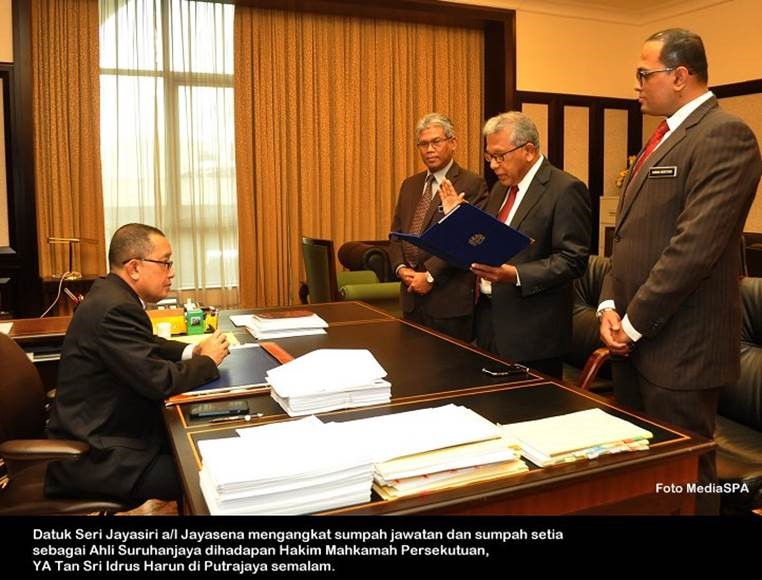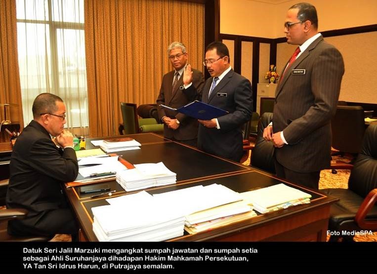 PUTRAJAYA, 15 Ogos ------ Suruhanjaya Perkhidmatan Awam Malaysia (SPA) telah menerima dua (2) orang Ahli Suruhanjaya yang baharu. Ahli-Ahli Suruhanjaya tersebut adalah Datuk Seri Jalil Marzuki dan Datuk Seri Jayasiri a/l Jayasena. Majlis mengangkat sumpah jawatan dan taat setia telah dijalankan dihadapan Hakim Mahkamah Persekutuan, YA Tan Sri Idrus Harun di Istana Kehakiman. Majlis mengangkat sumpah disaksikan oleh Setiausaha SPA, En. Zohari Said dan diiringi Setiausaha Bahagian Urus setia Mesyuarat Suruhanjaya, En. Ahmad Mokthar Shahul Hamid. Selepas majlis mengangkat sumpah jawatan Ahli-Ahli Suruhanjaya telah mengadakan perjumpaan bersama Pengerusi SPA, Tan Sri Zainal Rahim Seman.----- MediaSPA