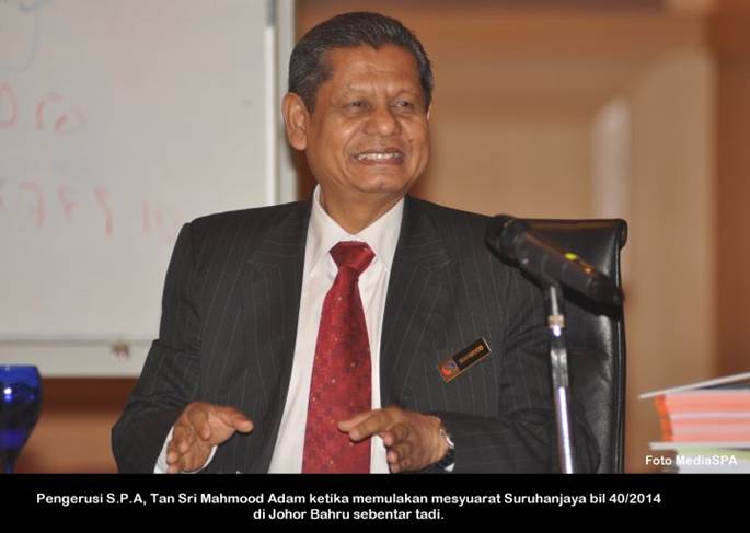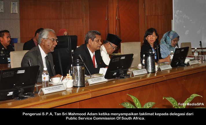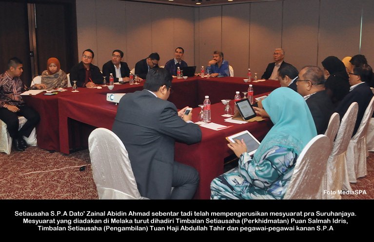 JOHOR BAHRU, 14 Nov ------ Suruhanjaya Perkhidmatan Awam (S.P.A) hari ini mengadakan Mesyuarat Suruhanjaya bil 40/2014 di Johor Bahru, Johor. Mesyuarat yang dipengerusikan Tan Sri Mahmood Adam turut dihadiri Timbalan Pengerusi Dato’ R. Segarajah, Ahli-Ahli Suruhanjaya, Setiausaha Datuk Ramli Juhari serta pegawai-pegawai kanan. Terdahulu Tan Sri Mahmood mengadakan Mesyuarat Pra Suruhanjaya di tempat yang sama. ------ MediaSPA