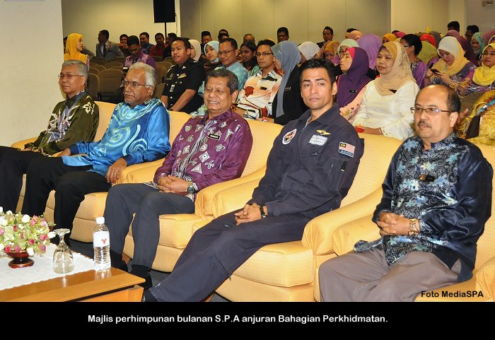 PUTRAJAYA, 26 Nov ------ Pengerusi S.P.A, Dato’ Seri Arpah Abdul Razak menyeru penjawat awam supaya mengamalkan cara hidup sihat kerana berupaya meningkatkan daya tumpuan dan fokus seseorang ke atas pelaksanaan tugasan seharian. Beliau berkata demikian dalam ucapan di perhimpunan bulanan Suruhanjaya Perkhidmatan Awam (S.P.A) di Putrajaya semalam. Katanya lagi “tubuh badan yang sihat, sudah tentu akan menyumbang kepada kecerdasan emosi dan pemikiran”. Turut hadir Setiausaha S.P.A, Dato’ Zainal Abidin Ahmad, Timbalan Setiausaha (Perkhidmatan) Puan Salmah Idris, Timbalan Setiausaha (Pengambilan) Tuan Haji Abdullah Tahir serta warga S.P.A.. ------  MediaSPA