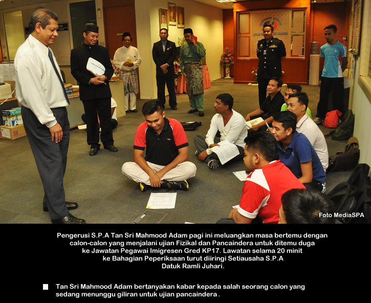 PUTRAJAYA, 6 Feb ------ Suruhanjaya Perkhidmatan Awam Malaysia (S.P.A) telah mengadakan peperiksaan online bagi jawatan Perangkawan Gred E41 yang diadakan pada Jumaat. Seramai 1,917 calon telah menduduki peperiksaan yang bermula jam 8.00 malam dan berakhir 10.15 malam. Turut hadir menyaksikan perjalanan peperiksaan, Pengerusi S.P.A Tan Sri Mahmood Adam dan Timbalan Dato' R. Segarajah sementara pusat peperiksaan pada kali ini telah diadakan di Putrajaya. Dalam satu kenyataan yang dikeluarkan oleh S.P.A, keputusan akan diketahui pada Isnin Jam 12.00 tengah hari selapas Mesyuarat Suruhanjaya pada hari berkenaan. ------ MediaSPA