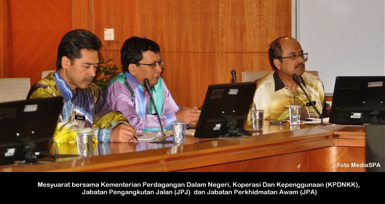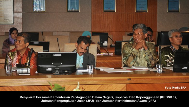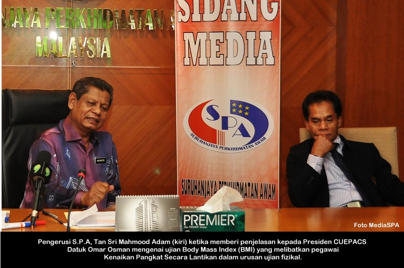 S,P.A, 19 September ------ Pengerusi S.P.A. YBhg. Tan Sri Mahmood Adam hari ini telah mempengerusikan Mesyuarat bersama Kementerian Perdagangan Dalam Negeri, Koperasi Dan Kepenggunaan (KPDNKK), Jabatan Pengangkutan Jalan (JPJ) dan Jabatan Perkhidmatan Awam (JPA). Mesyuarat ini diadakan bagi membincangkan keperluan ujian Body Mass Index (BMI) melibatkan pegawai Kenaikan Pangkat Secara Lantikan dalam urusan ujian fizikal Pegawai Penguatkuasa Gred N41 di KPDNKK dan JPJ. Hadir sama Setiausaha S.P.A, YBhg. Datuk Ramli Juhari, Timbalan Setiausaha (Pengambilan) Encik Zainal Abidin Ahmad, wakil pegawai dari JPA, KPDNKK dan JPJ . Mesyuarat yang diadakan di bilik Mesyuarat Suruhanjaya itu turut dihadiri Presiden Kongres Kesatuan Pekerja-Pekerja di Dalam Perkhidmatan Awam (CUEPACS), YBhg. Datuk Omar Osman. Dalam laporan akhbar semalam, CUEPACS meminta agar Suruhanjaya Perkhidmatan Awam (S.P.A) melonggarkan syarat ujian BMI bagi pegawai KPSL untuk jawatan beruniform. Sehubungan itu, YBhg. Datuk Omar telah diberikan penerangan lanjut oleh YBhg. Tan Sri Mahmood mengenai kepentingan ujian BMI tersebut terutama untuk jawatan beruniform. YBhg. Tan Sri juga turut menjelaskan kepada CUEPACS bahawa pegawai KPSL sebenarnya telah pun diberikan kelonggaran syarat BMI dan turut diberi pelbagai keistimewaan berbanding calon lantikan terus. Satu sidang media turut diadakan di tempat yang sama selepas mesyuarat berakhir. ------ MediaSPA