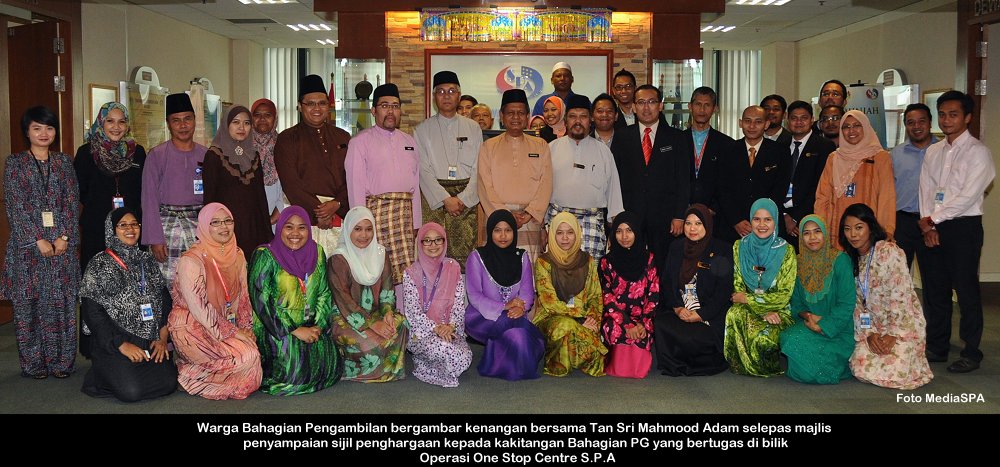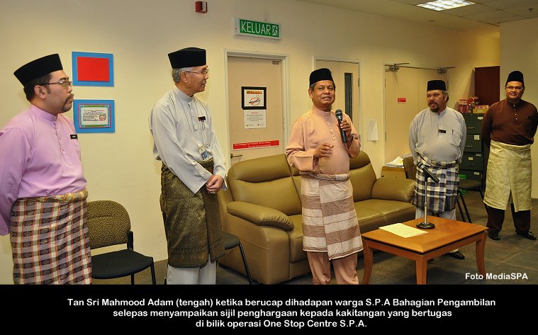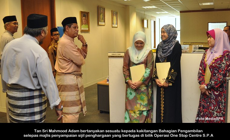 S,P.A, 20 September ------ Pengerusi S.P.A, YBhg. Tan Sri Mahmood Adam mengingatkan warga S.P.A supaya menjalankan tugas harian dengan teliti agar tidak melakukan kesilapan yang boleh menjejaskan nama baik S.P.A. “Kita tidak mahu mendengar aduan yang tidak elok daripada orang luar terutamanya yang berkaitan dengan urusan-urusan pengambilan”. Beliau berkata demikian dihadapan warga Bahagian Pengambilan selepas menyampaikan sijil kepada kakitangan bahagian itu yang bertugas secara giliran di bilik operasi One Stop Centre S.P.A. Menurutnya lagi, beliau mahu supaya kakitangan yang membuat urusan temu duga termasuklah penyerahan surat kepada calon mestilah diteliti terlebih dahulu sebelum dihantar kepada penerimanya. YBhg. Tan Sri Mahmood Adam juga memaklumkan bahawa S.P.A akan menerima seorang pegawai kanan yang dipinjamkan daripada Suruhanjaya Pencegahan Rasuah Malaysia (SPRM) untuk ditempatkan di sini. Diakhir ucapan, beliau meminta agar warga S.P.A membuat penambahbaikan berterusan dan digalakkan untuk berjumpa dengan penyelia masing-masing atau pegawai atasan mahupun terus kepada beliau sendiri dengan memberi cadangan untuk kebaikan organisasi kerana beliau yakin pegawai-pegawai di S.P.A bersedia untuk mendengar apa juga masalah terutama yang berkaitan dengan tugas seharian. ------ MediaSPA