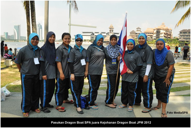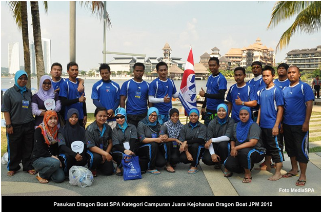 PUTRAJAYA 24 Jun ------ Pasukan Dragon Boat SPA Kategori Wanita dan Kategori Campuran muncul Juara dalam Kejohanan Dragon Boat JPM 2012, yang berlangsung di Kompleks Sukan Air Putrajaya, Presint 6, Putrajaya petang tadi. Sebanyak 6 pasukan terdiri daripada Kategori Wanita dan 10 pasukan daripada Kategori Campuran bertanding dalam kejohanan pada tahun ini. SPA juga muncul sebagai Juara Keseluruhan Pertandingan Dragon Boat yang disertai oleh Jabatan/Agensi dibawah JPM sempena Hari Keluarga Jabatan Perdana Menteri yang bermula pada 23 dan 24 Jun 2012. Turut hadir menyaksikan pertandingan, Setiausaha SPA, YBhg. Dato’ Lamien Sawiyo. Majlis penutupan dan penyampaian hadiah telah disempurnakan oleh YB. Tan Sri Nor Mohamed Yakcop, Menteri di Jabatan Perdana Menteri. ------ MediaSPA
