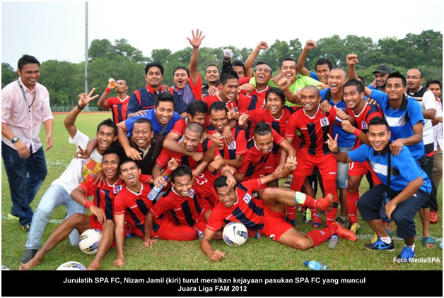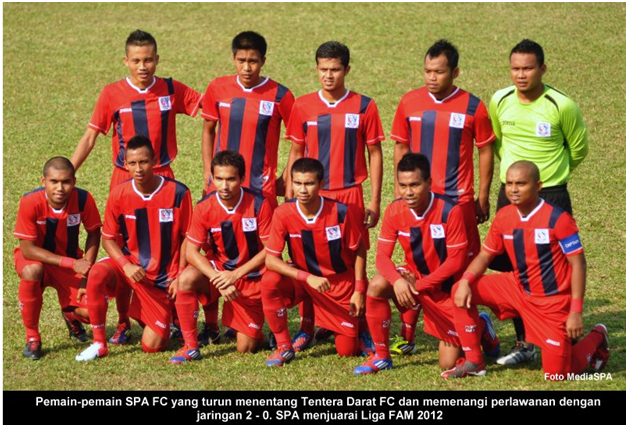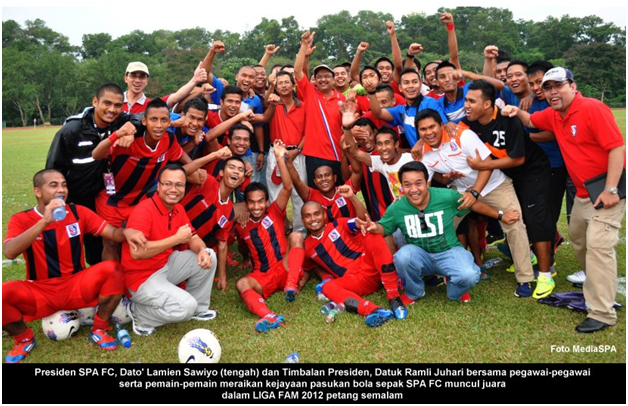 BANGI 24 Jun ------ SPA FC muncul Juara dalam Pertandingan Liga FAM 2012, setelah menewaskan pasukan TENTERA DARAT FC 2 – 0 dalam perlawanan yang berlangsung di Stadium Mini Petronas petang semalam. Walaupun hanya berbaki satu perlawanan iaitu menentang pasukan UiTM pada minggu hadapan, ia adalah sebagai pelengkap dan perlawanan terakhir dalam saingan Liga FAM 2012. SPA FC yang memperoleh 38 mata dan ianya tidak dapat di pintas oleh pesaing terdekat iaitu pasukan UiTM. Ketika mengulas perlawanan dan kejayaan yang dicapai, Presiden SPA FC YBhg. Dato’ Lamien Sawiyo mengucapkan tahniah dan terima kasih kepada pengurus, jurulatih, pemain-pemain serta semua yang terlibat termasuklah penyokong-penyokong SPA. ”Dengan kemenangan hari ini, kita (SPA FC) telah layak secara automatik untuk menyertai saingan Liga Perdana pada tahun hadapan". Dato’ Lamien Sawiyo juga turut mengucapkan tahniah kepada pasukan Dragon Boat Kategori Wanita dan Kategori Campuran yang menjadi Johan Dragon Boat JPM 2012. Sementara itu Timbalan Presiden SPA FC, YBhg. Datuk Ramli Juhari ketika diminta mengulas juga mengucapkan terima kasih dan tahniah atas kemenangan pasukan SPA FC, ”Saya mengucapkan tahniah kepada para pemain kerana menunjukkan mutu permainan yang konsisten dari awal permainan hingga ke akhir perlawanan”. Jurulatih SPA FC, Nidzam Jamil ketika diminta mengulas mengenai perlawanan dalam saingan Liga Perdana berkata, "Semua pemain SPA FC yang ada sekarang memang layak untuk bermain dalam Liga Perdana pada tahun hadapan." ------ MediaSPA