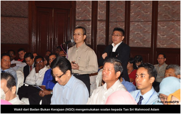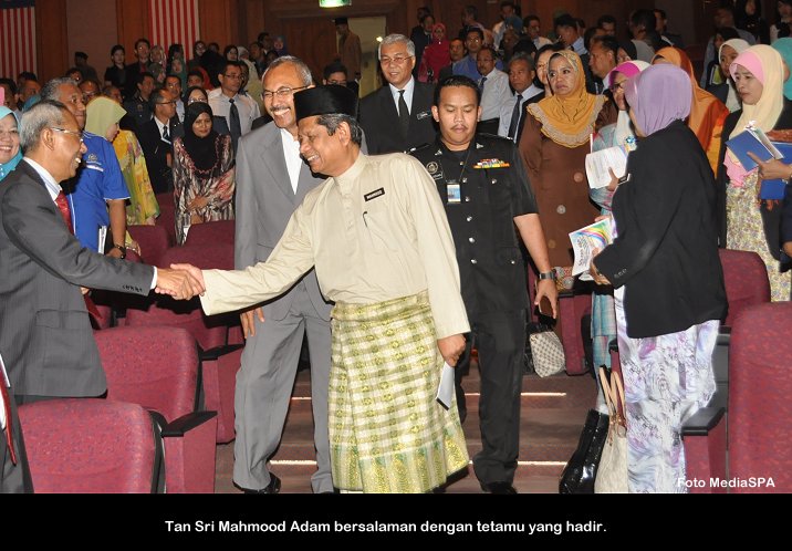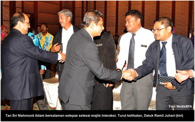 JOHOR BAHRU 26 Jun ------ Pengerusi SPA, YBhg. Tan Sri Mahmood Adam telah mengadakan Sesi Interaksi seterusnya dengan Ketua-Ketua Jabatan Persekutuan, Badan Bukan Kerajaan (NGO) Dan Pemimpin Masyarakat Negeri Johor semalam. Hadir sama, Timbalan Setiausaha (Pengambilan) YBhg. Datuk Ramli Juhari, Setiausaha Bahagian Pengambilan Khas, Encik Mohd. Shaiful Ibrahim dan pegawai-pegawai kanan SPA. Di dalam sesi tersebut, YBhg. Tan Sri Mahmood Adam telah menyampaikan maklumat merangkumi gaji, kemudahan yang boleh dinikmati penjawat awam, peluang kenaikan pangkat, pinjaman perumahan dan sebagainya. Pelbagai soalan telah dikemukanan oleh wakil-wakil Badan Bukan Kerajaan (NGO) terdiri kaum Cina dan India. Sejurus selepas majlis selesai, Pengerusi SPA telah mengadakan sidang media sempena majlis tersebut di tempat yang sama dan diikuti dengan lawatan ke Pusat Temu Duga SPA di Menara Ansar Johor Bahru, Johor. ------ MediaSPA