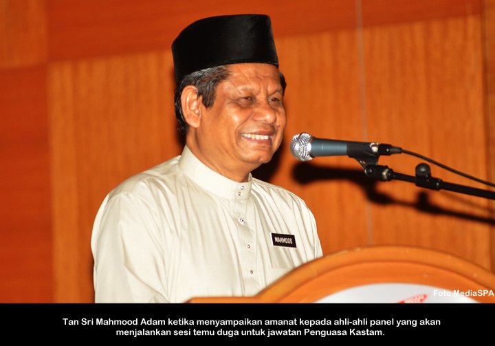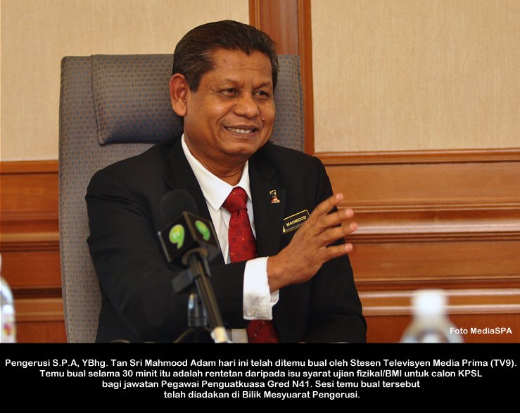 PUTRAJAYA, 3 Okt ------ Tan Sri Mahmood Adam berkata Suruhanjaya Perkhidmatan Awam akan mencari calon terbaik untuk dilantik ke jawatan Penguasa Kastam Gred W41 dalam sesi temu duga yang akan bermula 7 Oktober ini. “Insyallah S.P.A akan melantik calon yang menepati kriterier sebagaimana yang dimahukan oleh Kastam” . Beliau berkata demikian ketika menyampaikan amanat kepada pengerusi-pengerusi temu duga pada sesi taklimat Pra temu duga di Putrajaya, semalam. Menurutnya lagi S.P.A akan menjalankan sesi temu duga berasaskan Competency Base Interview (C.B.I). Seramai 30,810 orang calon akan di temu duga untuk mengisi kekosongan jawatan Penguasa Kastam bagi pelaksanaan GST yang akan bermula pada 1 April 2015. ------ MediaSPA