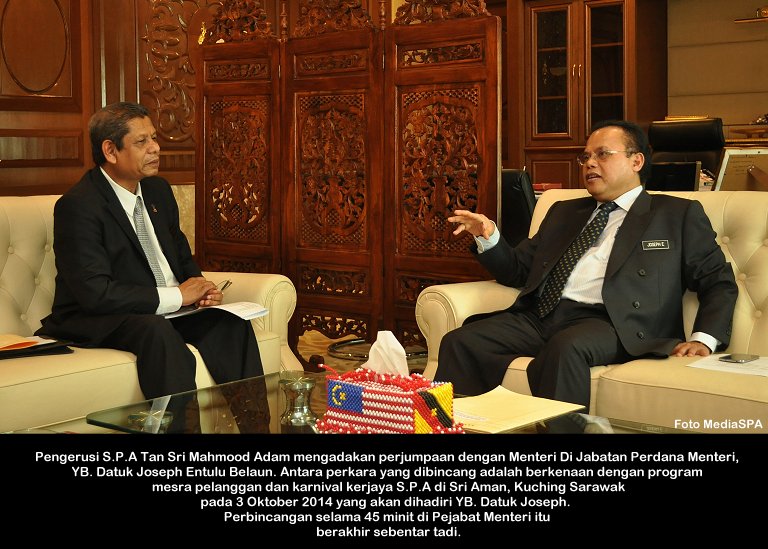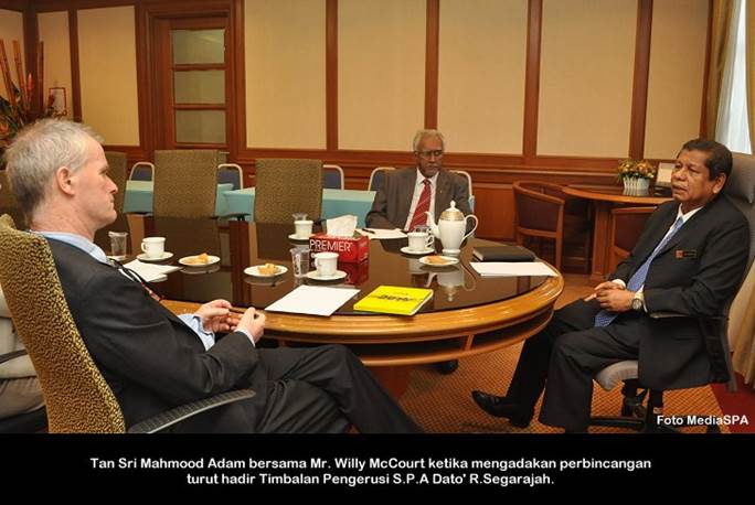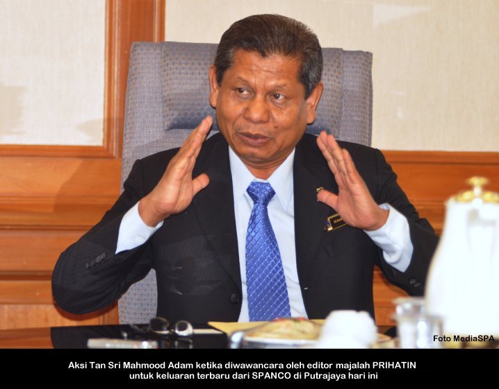 PUTRAJAYA, 24 November ------ Pengerusi S.P.A, YBhg. Tan Sri Mahmood Adam hari ini telah ditemu bual oleh editor majalah PRIHATIN iaitu keluaran Syarikat Sistem Pengangkutan Angkatan Nasional Company (SPANCO). SPANCO adalah merupakan syarikat yang membekalkan kenderaan secara pajakan yang digunakan oleh Kerajaan Persekutuan sejak 1994. Temu bual diadakan bertujuan untuk meminta pandangan dan berkongsi pengalaman YBhg. Tan Sri Mahmood Adam sejak beliau menggunakan kenderaan Jabatan yang dibekalkan oleh SPANCO. Antara topik temu bual selama 50 minit itu adalah berkenaan pengurusan, penambahbaikan dan kecekapan perkhidmatan yang diberikan oleh SPANCO. Turut hadir dalam sesi temu bual ialah Senior Manager Syarikat SPANCO iaitu Encik Shaheeran Jalalludin ------ MediaSPA