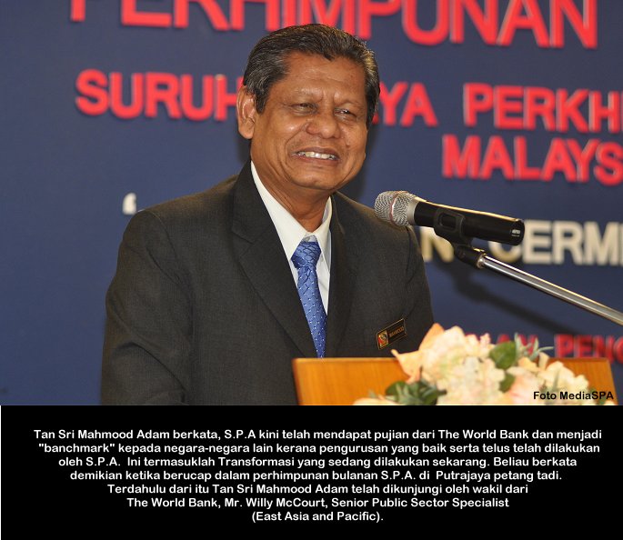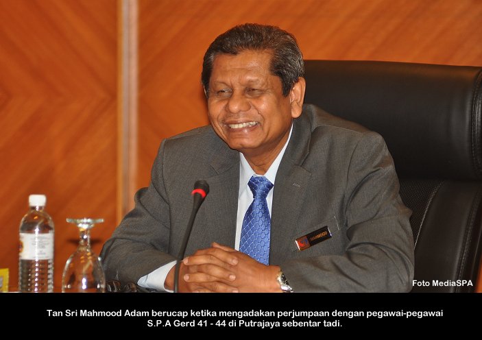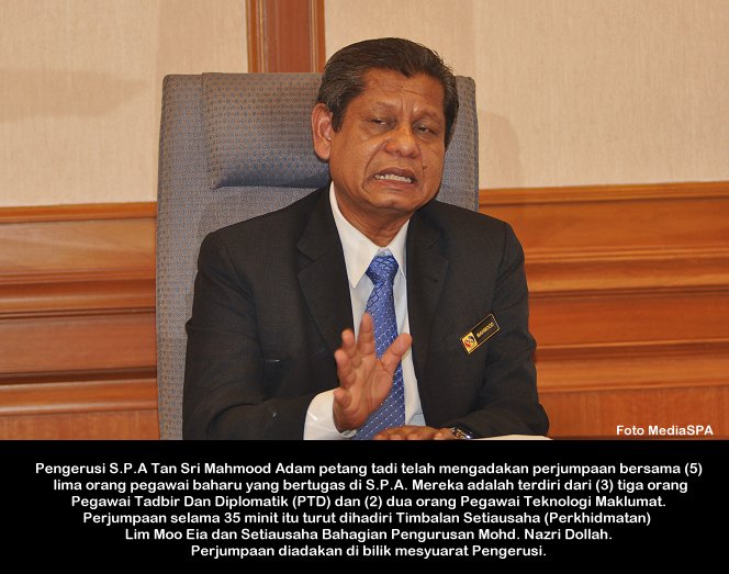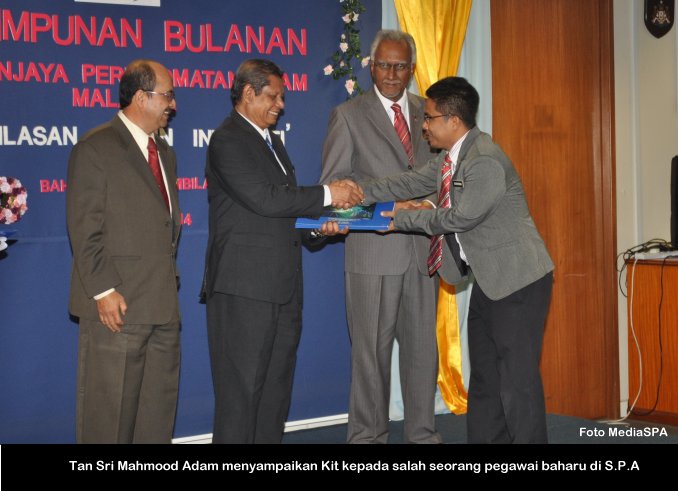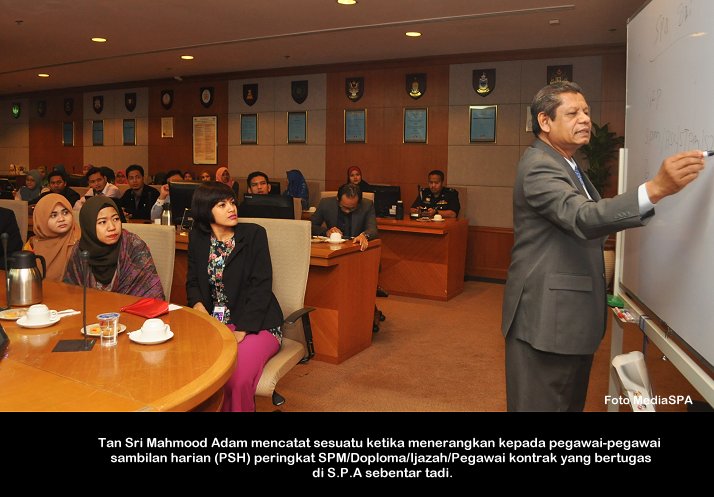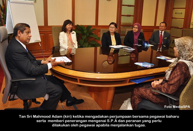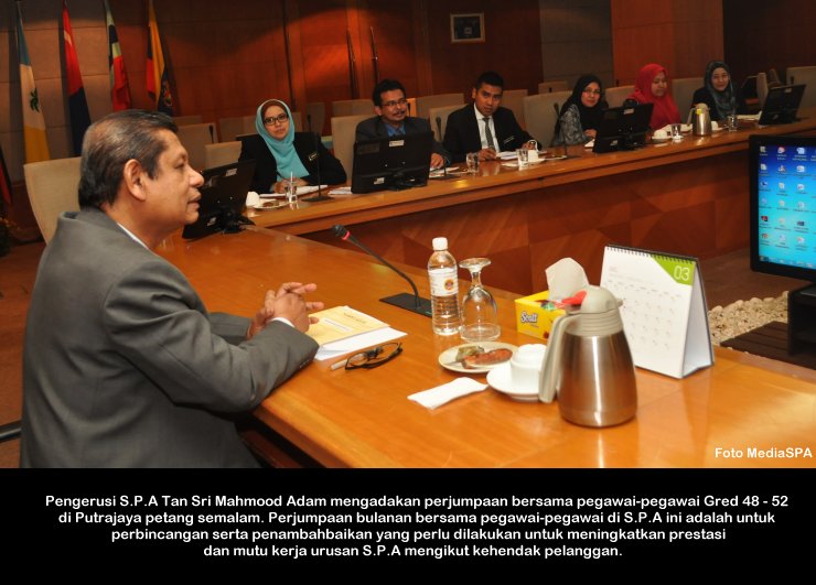 PUTRAJAYA, 4 Mac ------ Pengerusi S.P.A Tan Sri Mahmood Adam pagi ini mengadakan perjumpaan bersama Pegawai Sambilan Harian (PSH) Peringkat SPM/Doploma/Ijazah/Pegawai kontrak. Perjumpaan bulanan yang diadakan di S.P.A Putrajaya itu adalah berkaitan dengan kerjaya dan masa hadapan pegawai-pegawai berkenaan agar menjawat jawatan yang tetap mengikut kelayakan. Beliau juga menyeru agar pegawai-pegawai ini menghadiri kursus tips dan panduan memasuki perkhidmatan awam anjuran S.P.A supaya apabila mereka menghadiri sesi temu duga calon-calon ini menepati ciri-ciri penjawat awam yang dikehendaki jabatan mengikut jawatan yang dipohon. Tan Sri Mahmood juga menerangkan bahawa sesi intiview yang dijalankan oleh S.P.A adalah menggunakan kaedah Compentency Based Intiview (CBI) ------ MediaSPA