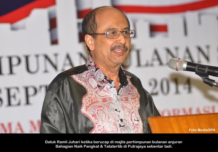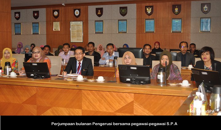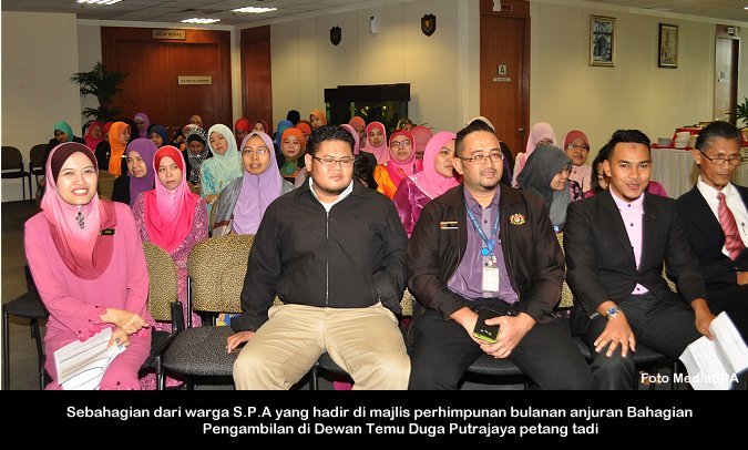 PUTRAJAYA, 2 Okt ------ Setiausaha Datuk Ramli Juhari berkata beliau menghargai warga S.P.A kerana bekerja dengan bersungguh-sungguh dan melaksanakan tugas tidak mengira waktu seperti yang dikehendaki terutama ketika menjalankan urusan Peperiksaan Online yang dilaksanakan S.P.A sekarang. “Mereka ini boleh bekerja dari siang hingga malam dan menghabiskan tugas hingga awal pagi” beliau berkata demikian ketika berucap dimajlis perhimpunan bulanan S.P.A di Putrajaya sebentar tadi. Menurutnya lagi, setiap aduan pelanggan yang dihantar menerusi e-aduan juga telah dapat dijawab dalam tempoh (3) tiga hari seperti yang ditetapkan. Yang turut hadir, Timbalan Setiausaha (Pengambilan) Zainal Abidin Ahmad, Timbalan Setiausaha (Perkhidmatan) Lim Mooi Eia serta warga S.P.A. ------ MediaSPA