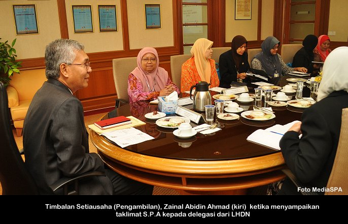 SPA, 10 Disember ------ Suruhanjaya Perkhidmatan Awam (S.P.A) hari ini telah menerima lawatan dari Lembaga Hasil Dalam Negeri (LHDN). Delegasi seramai lapan (8) orang pegawai dari LHDN itu diketuai oleh Puan Latifah Zabidi, Pengarah Bahagian Sumber Manusia. Tujuan lawatan ini diadakan adalah untuk mengetahui lebih lanjut mengenai kaedah pengambilan secara profiling (MyRecruitment) yang dilaksanakan oleh S.P.A. Taklimat mengenai urusan pengambilan di S.P.A telah disampaikan oleh Timbalan Setiausaha (Pengambilan), Encik Zainal Abidin Ahmad. ------ MediaSPA