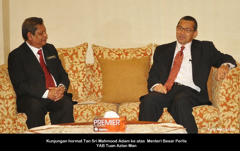 PERLIS, 18 Nov ------ Pengerusi S.P.A, YBhg. Tan Sri Mahmood Adam hari ini telah membuat kunjungan hormat ke atas Menteri Besar Perlis, YAB. Azlan Man. Turut bersama dalam kunjungan hormat tersebut, Setiausaha S.P.A, YBhg. Datuk Ramli Juhari dan Pegawai Tugas-tugas Khas, YBhg. Datuk Salim Hashim dan Datuk Mustapha Ahmad S. Marican. Terdahulu dari itu pada pagi tadi YBhg. Tan Sri Mahmood Adam telah mempengerusikan Mesyuarat Suruhanjaya yang diadakan di Kompleks Unit Pencegah Penyeludupan Bukit Kayu Hitam, Kedah. Satu taklimat turut diadakan yang disampaikan oleh Komander UPP Negeri Kedah iaitu Tuan Abdul Latif Abdul Rahman. Pada sebelah malam pula, Pengerusi S.P.A telah menyertai kursus Competency Based Interview (CBI) dan seterusnya mempengerusikan mesyuarat bersama Pengerusi-Pengerusi dan Setiausaha-Setiausaha SPA Negeri di Hotel Seri Malaysia Kangar, Perlis. ------  MediaSPA