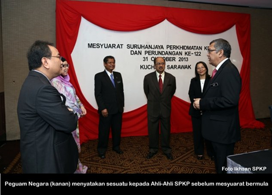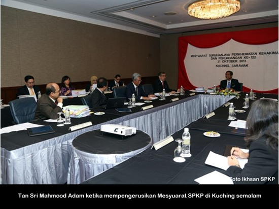 KUCHING, 31 Oktober------ Suruhanjaya Perkhidmatan Kehakiman dan Perundangan (SPKP) telah mengadakan Mesyuarat Suruhanjaya kali ke-122 di Kuching, Sarawak. Mesyuarat telah dipengerusikan oleh Pengerusi S.P.A, yang juga merupakan Pengerusi SPKP, YBhg. Tan Sri Mahmood Adam. Mesyuarat dihadiri oleh Ahli-Ahli SPKP iaitu YBhg. Peguam Negara Malaysia, YAA Presiden Mahkamah Rayuan Malaysia, YAA Hakim Besar Malaya, YAA Hakim Besar Sabah dan Sarawak, YA Hakim Mahkamah Rayuan serta dua orang YA Hakim Mahkamah Tinggi. Mesyuarat turut dihadiri oleh YBhg. Datuk Ramli Juhari, Setiausaha SPKP, Jemaah Pegawai SPKP iaitu YBhg. Peguam Cara Negara dan YBhg. Ketua Pendaftar Mahkamah Persekutuan serta pegawai-pegawai kanan Urus Setia SPKP. Suruhanjaya telah menimbang dan membuat keputusan bagi urusan Pelantikan, Kenaikan Pangkat, Pemangkuan, Penamatan Pemangkuan Pegawai Undang-Undang termasuk perkara-perkara dasar berkaitan perkhidmatan kehakiman dan perundangan. Selain itu, kertas pertimbangan Suruhanjaya secara edaran dan urusan pengesahan dalam perkhidmatan, pemberian taraf berpencen serta penetapan gaji permulaan oleh Jemaah Pegawai SPKP telah diratifikasikan Suruhanjaya. ------ MediaSPA