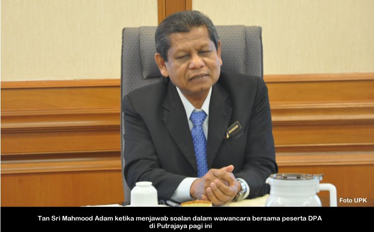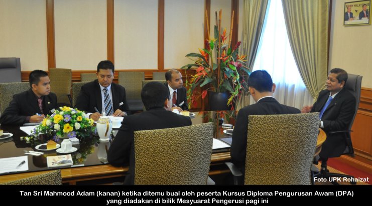 S.P.A, 14 Ogos ------ Pengerusi S.P.A, YBhg. Tan Sri Mahmood Adam hari ini telah diwawancara oleh peserta Kursus Diploma Pengurusan Awam (DPA). Wawancara yang diadakan di bilik Mesyuarat Pengerusi itu telah di hadiri oleh 5 (lima) orang peserta yang sedang menjalani Kursus Diploma Pengurusan Awam di INTAN. Tujuan wawancara ini diadakan sebagai tanda penghormatan bagi tokoh kepimpinan dalam Perkhidmatan Awam untuk modul komunikasi kepimpinan bagi diploma pengurusan awam. ------ MediaSPA