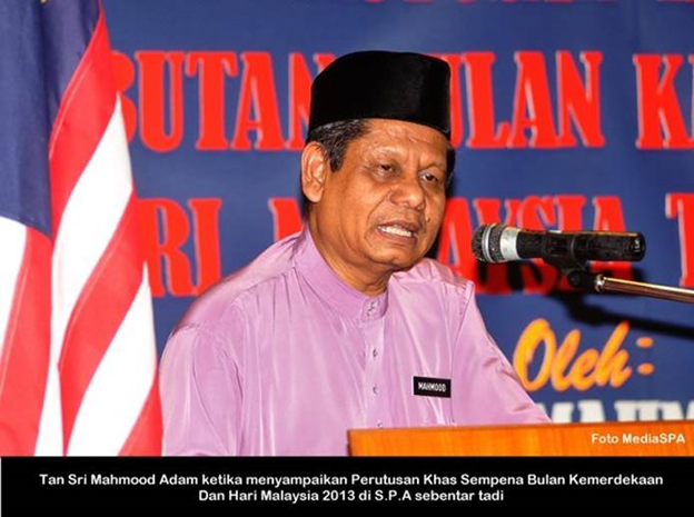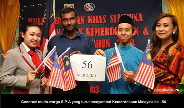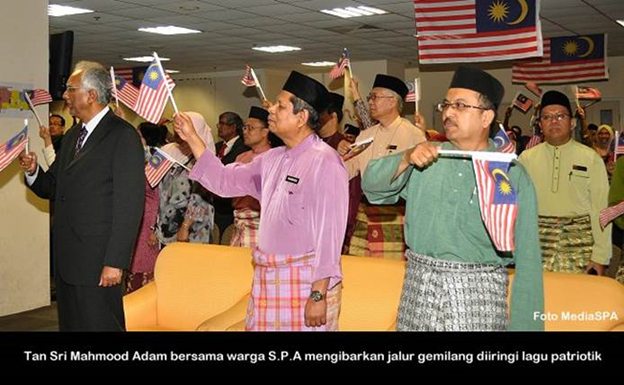 S.P.A, 30 Ogos------ Suruhanjaya Perkhidmatan Awam Malaysia (S.P.A) hari ini telah mengadakan Majlis Perutusan Khas Sempena Bulan Kemerdekaan 2013. Majlis yang diadakan di Dewan Temu Duga Aras 6, S.P.A, Putrajaya telah dihadiri oleh Pengerusi S.P.A, YBhg. Tan Sri Mahmood Adam. Turut hadir , Timbalan Pengerusi S.P.A, YBhg. Dato’ R. Segarajah, Setiausaha S.P.A, YBhg. Datuk Ramli Juhari dan warga S.P.A. Majlis dimulakan dengan lagu-lagu patriotik oleh kumpulan Koir S.P.A dan deklamasi sajak kemerdekaan yang disampaikan oleh Puan Maznida Mahadi. Dalam perutusan khas yang disampaikan oleh YBhg. Tan Sri Mahmood Adam, beliau berkata adalah menjadi tanggungjawab kita semua untuk sama-sama memastikan kemerdekaan ini akan berkekalan bagi tanda kedaulatan dan ia merupakan perkara yang amat penting bagi sesebuah Negara. Beliau juga berkata, S.P.A telah menjangkau 56 tahun penubuhannya dan dalam usia 56 tahun ini, S.P.A sewajarnya terus relevan dalam arus semasa. Majlis diakhiri dengan nyanyian beramai-ramai lagu Jalur Gemilang sambil mengibarkan bendera. ------MediaSPA