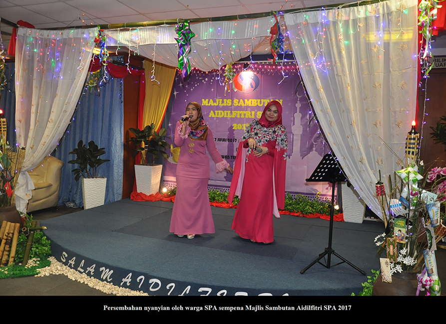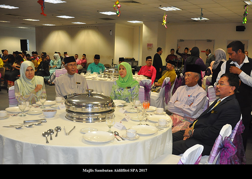 PUTRAJAYA, 17 Julai ----- SMajlis Sambutan Aidilfitri SPA tahun 2017 telah diadakan bertempat di Dewan Temu Duga SPA, Aras 6. Majlis diserikan lagi dengan kehadiran YBhg. Tan Sri Arpah Abdul Razak, Pengerusi SPA, YBhg. Dato’ Zainal Abidin Bin Ahmad, Setiausaha SPA, Ahli-ahli Suruhanjaya, pegawai kanan SPA dan warga SPA. Warga SPA telah disajikan dengan pelbagai juadah raya seperti lemang, rendang, ketupat, soto, sate dan kuih-muih. Selain itu, majlis juga dimeriahkan dengan persembahan nyanyian lagu Hari Raya daripada warga SPA diiringi oleh kumpulan Buskers SPA.