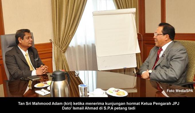 S.P.A, 8 Mei ------ Ketua Pengarah Jabatan Pengangkutan Jalan (JPJ) yang baharu, YBhg. Dato' Ismail Ahmad hari ini telah membuat kunjungan hormat ke atas Pengerusi Suruhanjaya Perkhidmatan Awam Malaysia (S.P.A), YBhg. Tan Sri Mahmood Bin Adam. Ketibaan beliau bersama pegawai-pegawai kanan disambut oleh YBhg. Tan Sri Mahmood Adam dan seterusnya mengadakan perbincangan di bilik Mesyuarat Pengerusi. Beliau telah dilantik sebagai Ketua Pengarah JPJ bermula pada 25 Mac 2013, menggantikan YBhg. Datuk Seri Solah Mat Hassan.------ MediaSPA