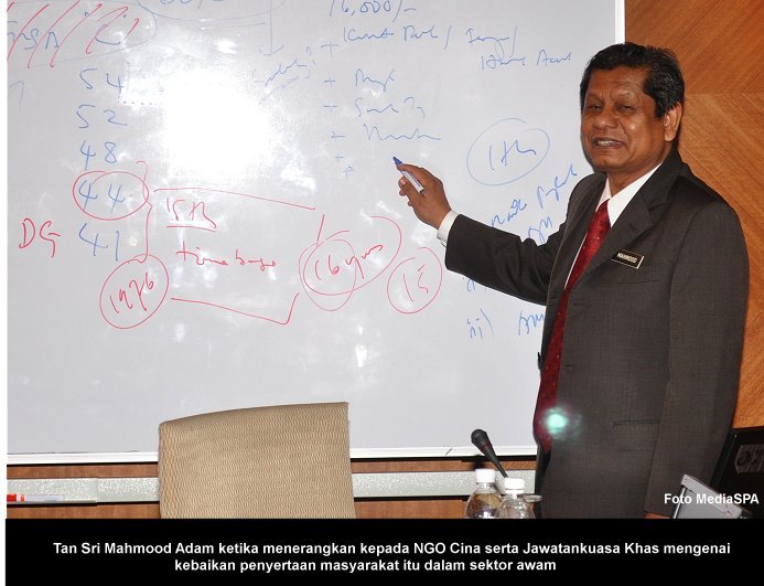 S.P.A, 21 Jun ------ Pengerusi S.P.A, YBhg. Tan Sri Mahmood Adam hari ini telah mempengerusikan Mesyuarat Jawatankuasa Mengkaji Penyertaan Kaum Cina dalam sektor awam. Mesyuarat yang diadakan di bilik Mesyuarat Suruhanjaya turut dihadiri oleh Timbalan Setiausaha (Perkhidmatan), Puan Lim Mooi Eia serta ahli jawatankuasa khas yang dilantik S.P.A dari kalangan NGO Cina. Ahli jawatankuasa khas yang dilantik turut memberi pandangan serta cadangan untuk meningkatkan penyertaan dari kalangan masyarakat cina untuk berkhidmat dalam sektor awam. ------  MediaSPA
