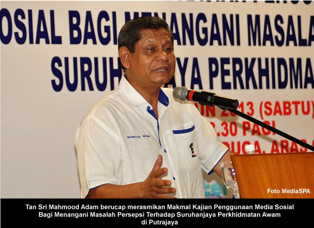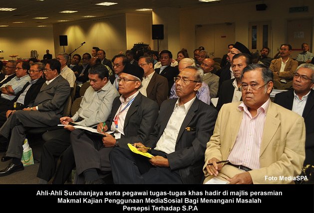S.P.A, 29 Jun ------ Pengerusi S.P.A, YBhg. Tan Sri Mahmood Adam hari ini telah merasmikan Makmal Kajian Penggunaan Media Sosial Bagi Menangani Masalah Persepsi Terhadap S.P.A. Majlis yang diadakan bertempat di Dewan temu duga S.P.A telah dihadiri oleh Ahli Jawatankuasa Khas yang dilantik oleh S.P.A iaitu NGO Melayu, Cina, India dan Dayak. Turut hadir Timbalan Pengerusi S.P.A, YBhg. Dato' R. Segarajah, Ahli-Ahli Suruhanjaya, Setiausaha S.P.A, YBhg. Datuk Ramli Juhari, Timbalan Setiausaha (Pengambilan), Encik Zainal Abidin Ahmad, Timbalan Setiausaha (Perkhidmatan) Puan Lim Mooi Eia, Pegawai Tugas-Tugas Khas dan pegawai-pegawai kanan S.P.A. Terdahulu dari itu, kumpulan-kumpulan NGO telah mengadakan aktiviti perbincangan mengikut kumpulan. Tujuan makmal ini diadakan adalah untuk menangani persepsi negatif terhadap S.P.A. dan meningkatkan mutu perkhidmatan S.P.A. Taklimat telah disampaikan oleh penceramah jemputan iaitu Encik Sasongko dari Media Intelligence dan Tun Mahereza dari TMX. ------ MediaSPA