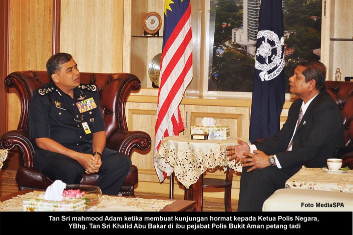 KUALA LUMPUR, 28 Mei ------ Pengerusi S.P.A, YBhg. Tan Sri Mahmood Adam hari ini telah membuat kunjungan hormat kepada Ketua Polis Negara, YBhg. Tan Sri Khalid Abu Bakar. Kunjungan yang diadakan di Ibu Pejabat Polis Bukit Aman Kuala Lumpur itu telah berlangsung selama 40 minit. YBhg. Tan Sri Khalid Abu Bakar dilantik sebagai Ketua Polis Negara pada 17 Mei 2013 menggantikan YBhg. Tan Sri Ismail Omar yang telah bersara wajib. ------ MediaSPA