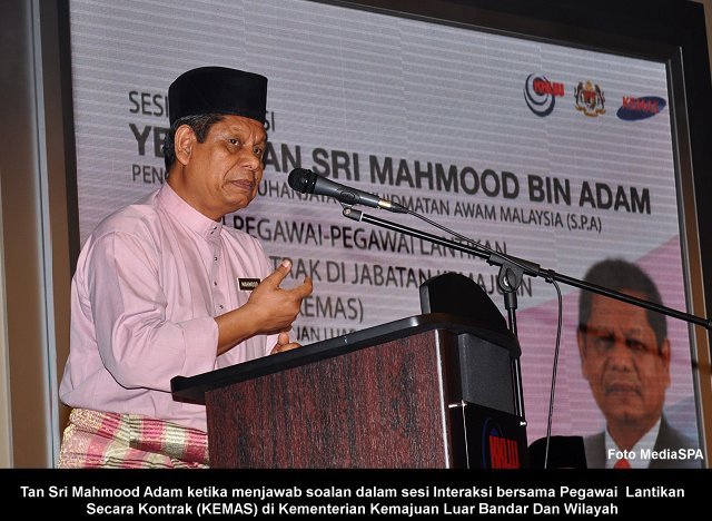 PUTRAJAYA, 7 Februari ------ Pengerusi SPA, YBhg. Tan Sri Mahmood Adam telah mengadakan sesi interaksi dengan pegawai-pegawai Lantikan Secara Kontrak Di Jabatan Kemajuan Masyarakat (KEMAS), Kementerian Kemajuan Luar Bandar Dan Wilayah, Jumaat lepas . Sesi interaksi yang diadakan di Dewan Serbaguna, Kementerian Kemajuan Luar Bandar dan Wilayah, Putrajaya turut dihadiri oleh Setiausaha SPA, YBhg. Datuk Ramli Juhari, Ketua Pengarah Kemas YBhg. Dato' Hassan Mohd Amin. Turut hadir Timbalan Setiausaha (Pengambilan), Encik Zainal Abidin Ahmad serta pegawai-pegawai kanan SPA. Sesi interaksi ini bertujuan untuk mendapatkan maklum balas dan ekspektasi pegawai-pegawai lantikan kontrak terhadap SPA selaku Pihak Berkuasa Melantik (PBM) yang utama dalam Perkhidmatan Awam. Satu sidang media turut diadakan selepas majlis sesi interaksi berakhir di tempat yang sama. Sementara itu pada sebelah petang, YBhg. Tan Sri Mahmood Adam telah mengadakan perjumpaan bersama wakil-wakil Penyelia KEMAS negeri-negeri di bilik Mesyuarat Suruhanjaya. ------ MediaSPA