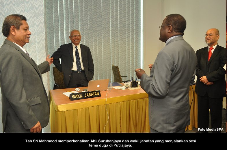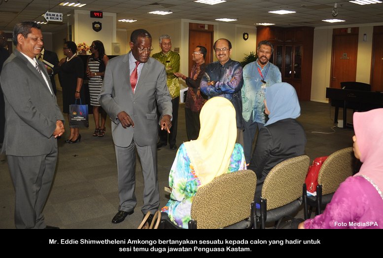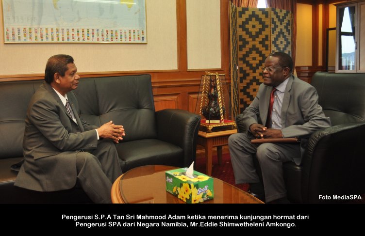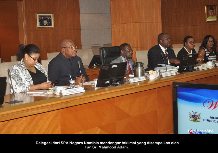 PUTRAJAYA, 16 Okt ------ Suruhanjaya Perkhidmatan Awam (S.P.A) hari ini menerima kunjungan dari SPA Negara Namibia. Delegasi dari Negara itu diketuai oleh Pengerusinya Mr. Eddie Shimwetheleni Amkongo bersama Setiausaha dan Ahli-Ahli Suruhanjaya. Ketibaan delegasi disambut oleh Pengerusi Tan Sri Mahmood Adam dan sesi taklimat mengenai S.P.A telah disampaikan oleh beliau. Rombongan turut dibawa melawat ke dewan temu duga.  ------  MediaSPA