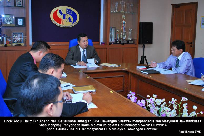 KUCHING, 4 Julai------ Urus Setia S.P.A Cawangan Sarawak hari ini telah mengadakan Mesyuarat jawatankuasa khas bagi mengkaji penyertaan kaum Melayu ke dalam Perkhidmatan Awam. Mesyuarat dipengerusikan oleh Setiausaha Bahagian Urus Setia S.P.A Cawangan Sarawak, Abdul halim Abang Nail. Mesyuarat yang berakhir sebentar tadi diadakan dibilik mesyaurat SPA Cawangan Sarawak. ------ MediaSPA