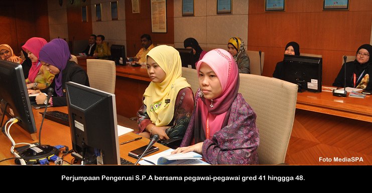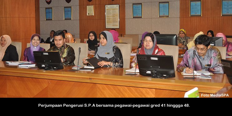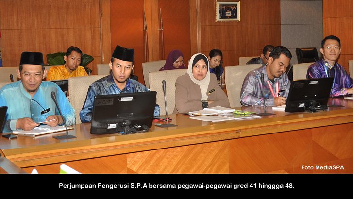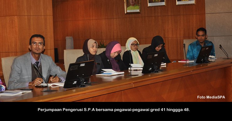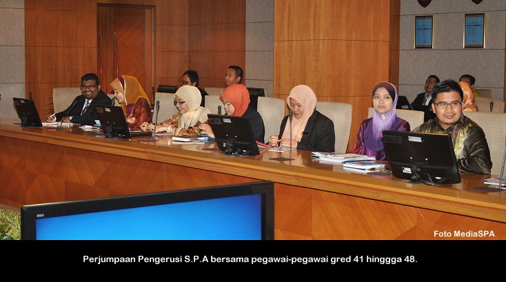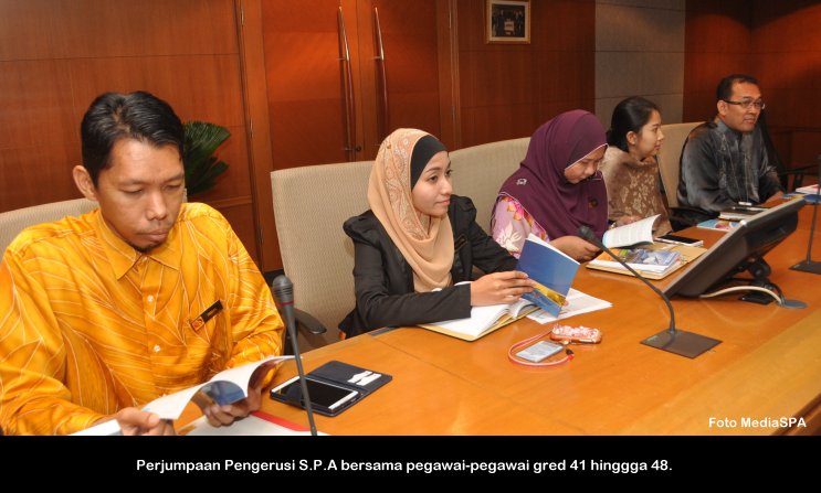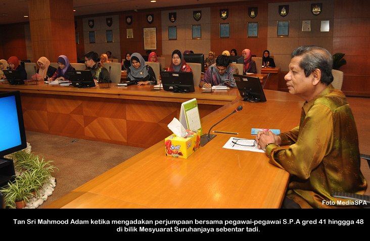 PUTRAJAYA 10 Julai ------ Pengerusi S.P.A Tan Sri Mahmood Adam sebentar tadi mengadakan perjumpaan bersama pegawai-pegawai gred 41 – 48 yang bertugas di S.P.A. Antara lain perbincangan yang diadakan di bilik Mesyuarat Suruhanjaya itu adalah berkenaan keberkesanan kursus tips dan panduan memasuki perkhidmatan awam yang sedang dilaksanakan di Suruhanjaya Perkhidmatan Awam, statastik permohonan jawatan, NGO, CBI, SITF. Perjumpaan hampir dua (2) jam yang berakhir sebentar tadi dihadiri seramai 39 orang pegawai. ------  MediaSPA